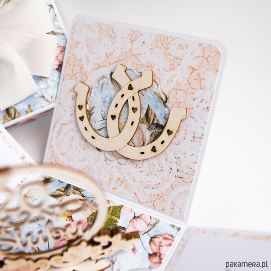 Na środku pudełeczka znajduje się dekoracja z papierowymi kwiatuszkami, na ściankach motyw serca, życzenia dla solenizantów, miejsce na podpis oraz splecione ze sobą obrączki.