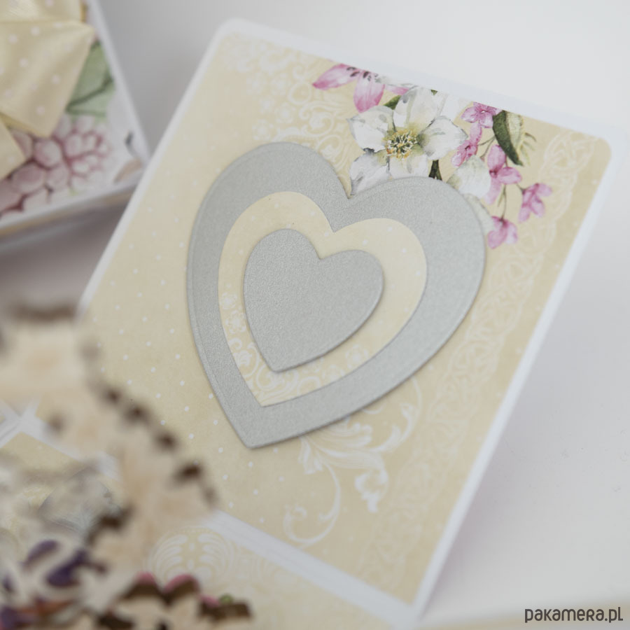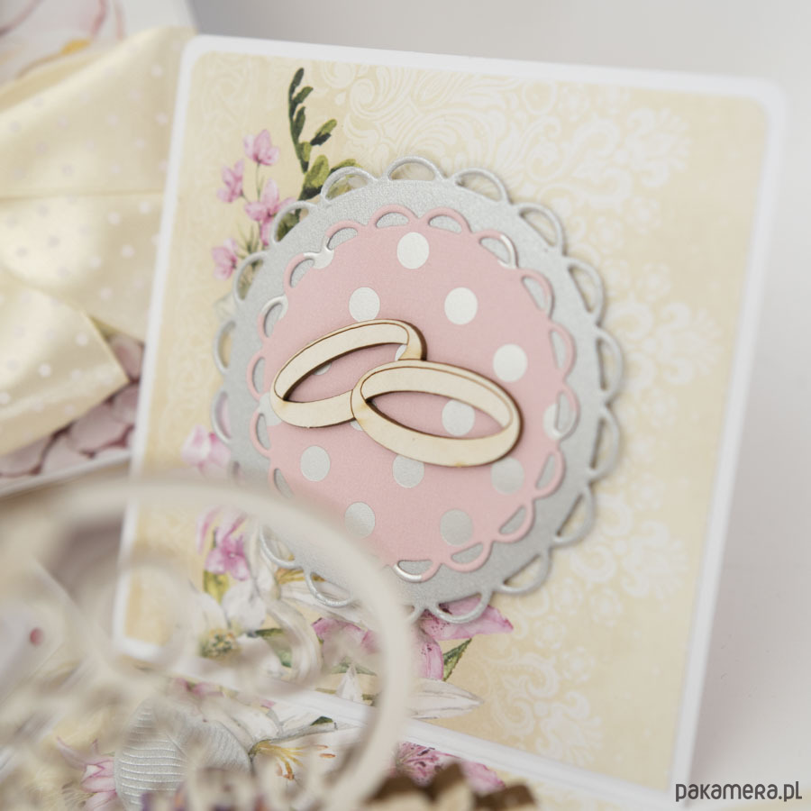 Na środku pudełeczka znajduje się dekoracja z papierowymi kwiatuszkami, na ściankach motyw serca, życzenia dla solenizantów, miejsce na podpis oraz splecione ze sobą obrączki.