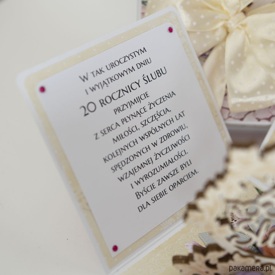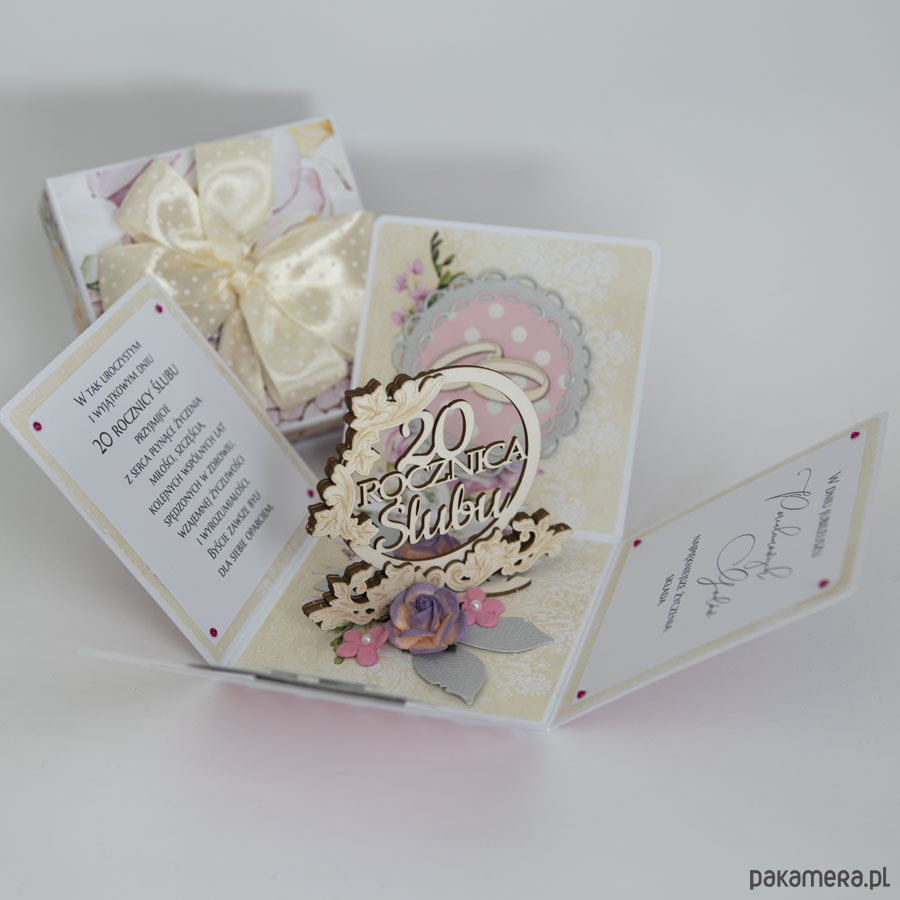 Ręcznie robiona kartka z okazji 20 rocznicy ślubu w formie rozkładanego pudełeczka.