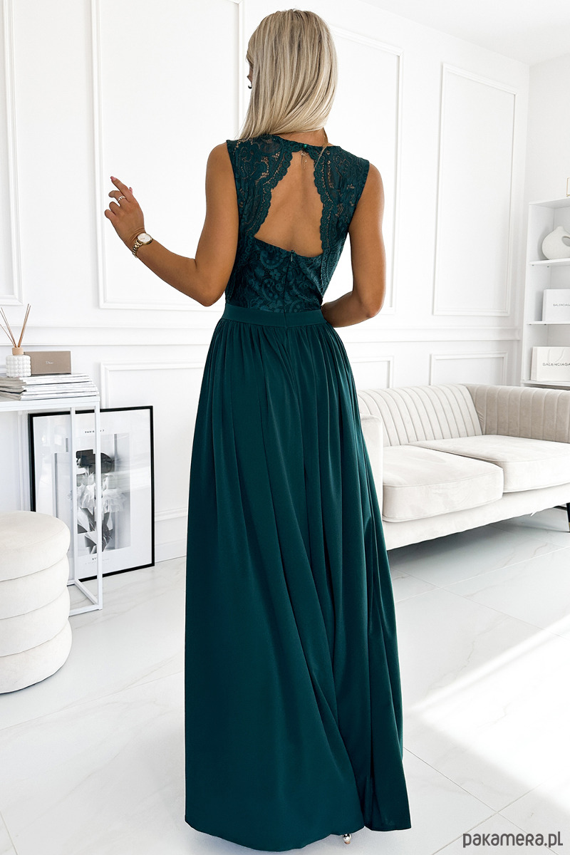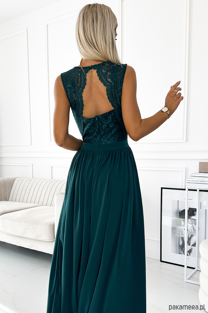 211-6 LEA długa suknia z koronkowym dekoltem - ZIELEŃ BUTELKOWA