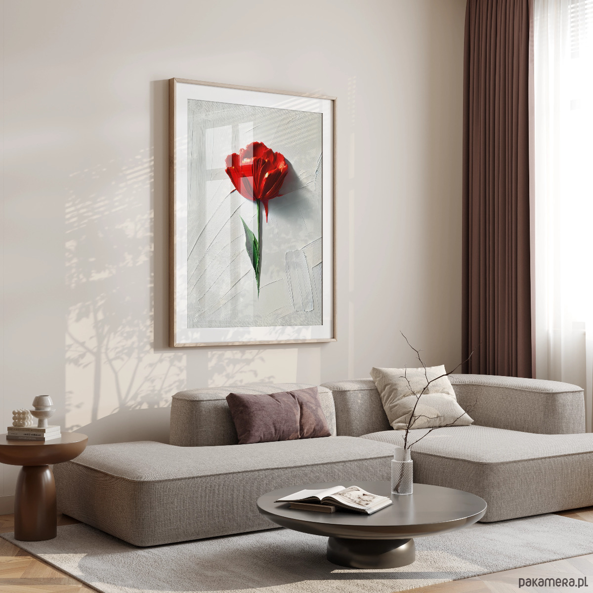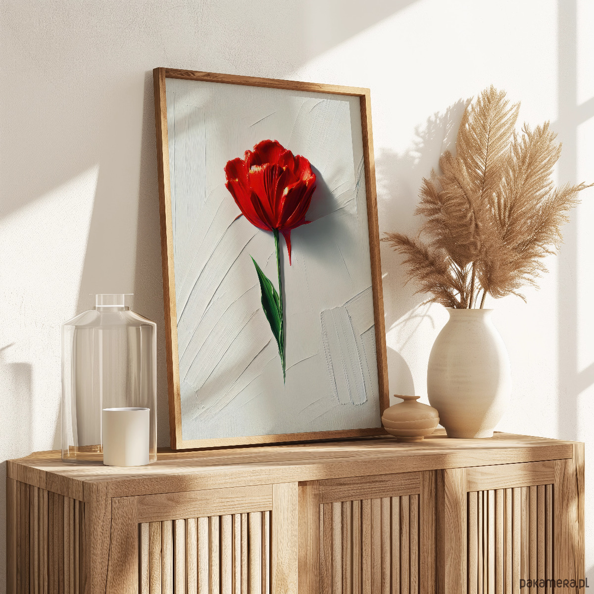 „Szept tulipana” to plakat, który łączy prostotę formy z siłą koloru. Na jasnym tle wyłania się intensywnie czerwony kwiat – delikatny, a jednocześnie wyrazisty symbol życia, emocji i ulotnego piękna.