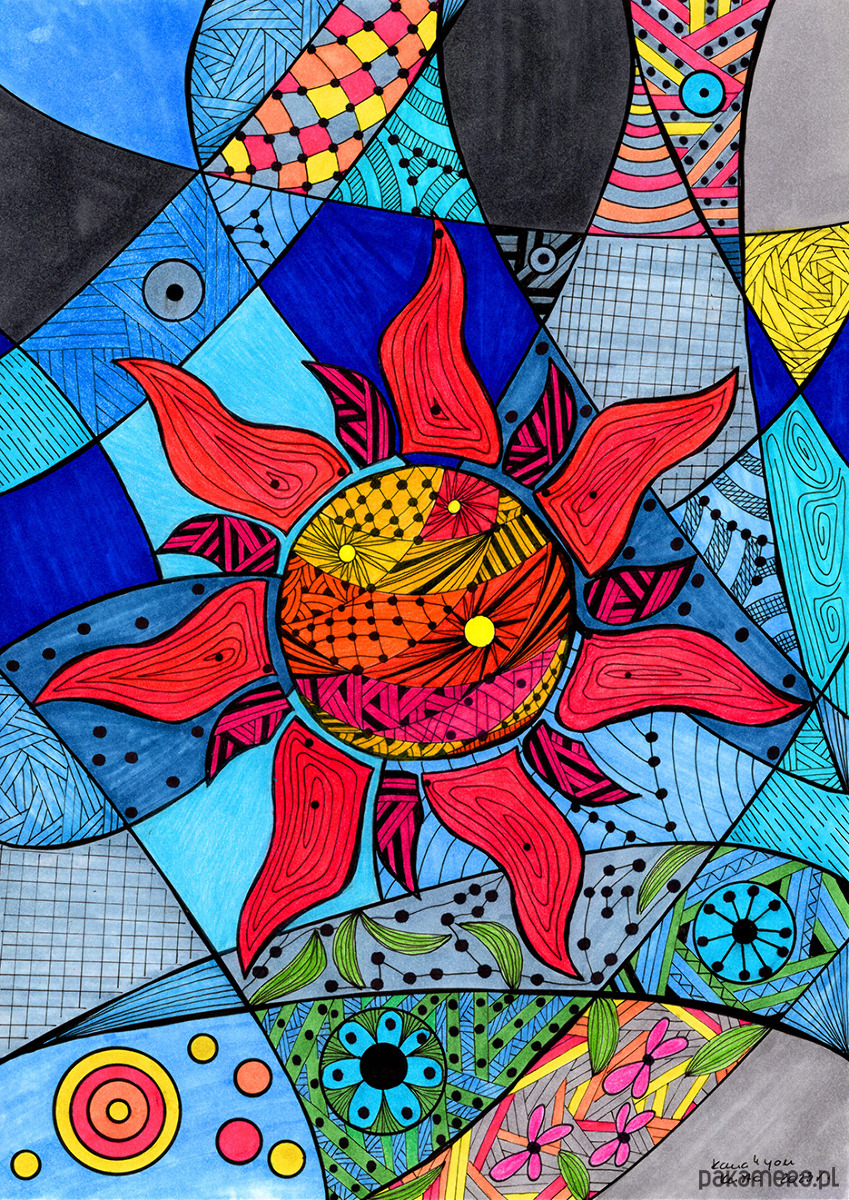Ekspresyjna, geometryczna ilustracja z dominującym, płonącym słońcem o intensywnie czerwonych i pomarańczowych promieniach. Słońce otoczone jest chaosem abstrakcyjnych, ostrych kształtów w odcieniach chłodnego błękitu i szarości, co podkreśla kontrast termiczny. Słońce i tło wypełnione są skomplikowanymi wzorami liniowymi, tworząc wrażenie gorąca, wibracji i dramatycznego napięcia między palącym żywiołem a otaczającym go światem.