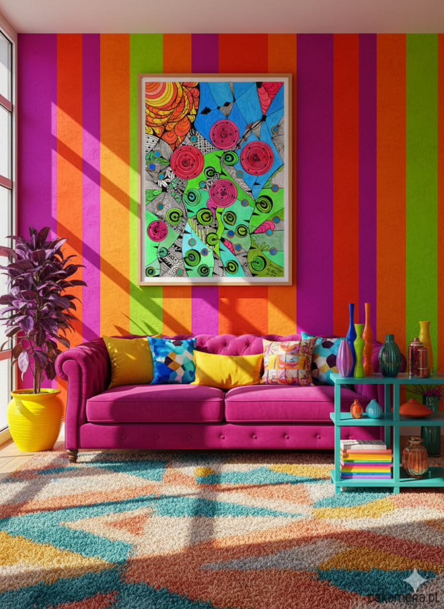 Dynamiczna, chaotyczna ilustracja przedstawiająca organiczne, pnące się róże w jaskrawych, neonowych kolorach.