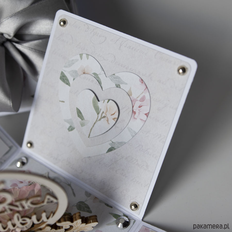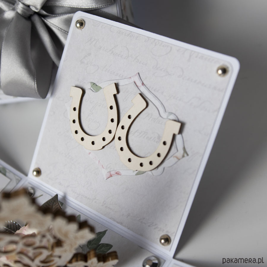 Na środku pudełeczka znajduje się dekoracja z papierowymi kwiatuszkami, na ściankach motyw serca, życzenia dla solenizantów, miejsce na podpis oraz dwie podkowy na szczęście.