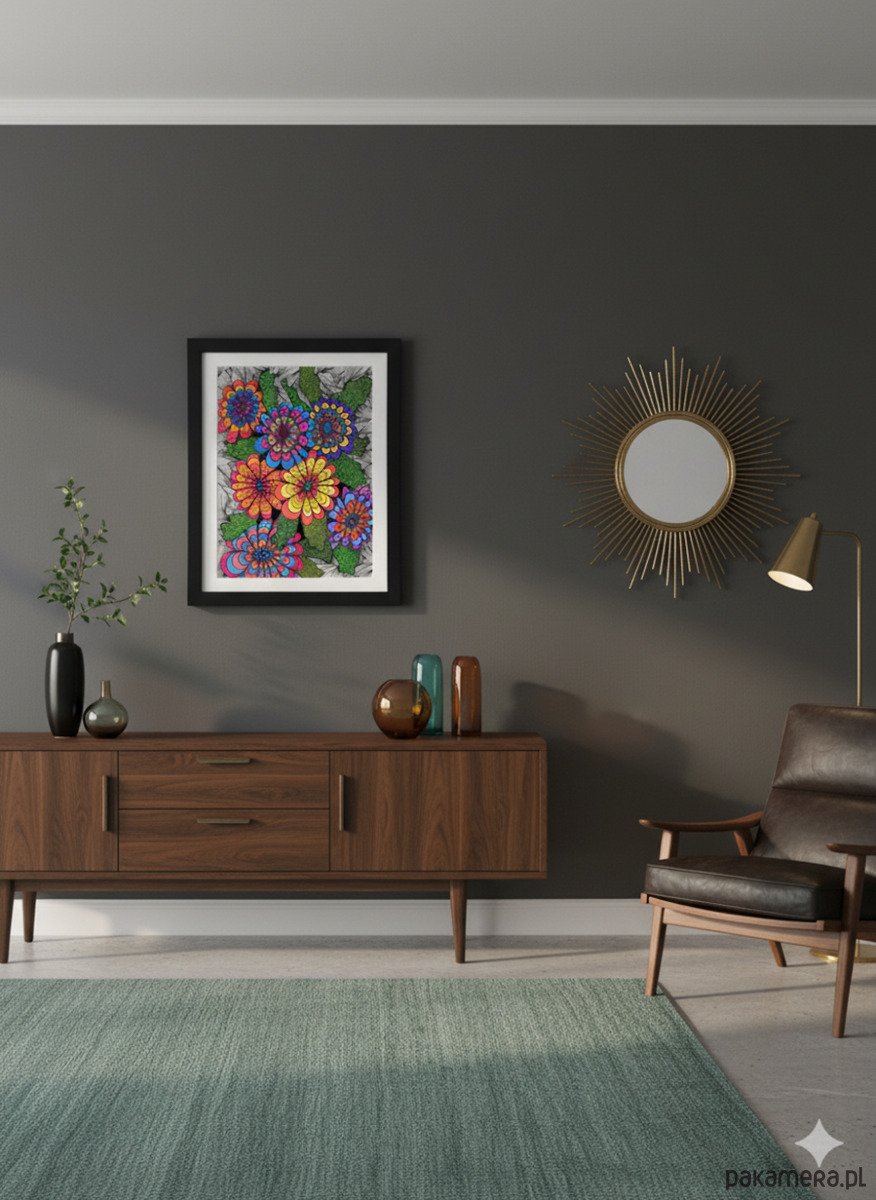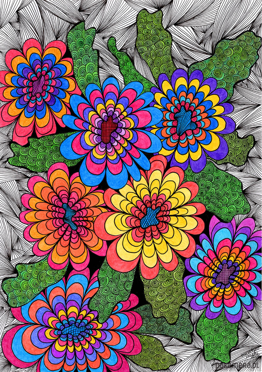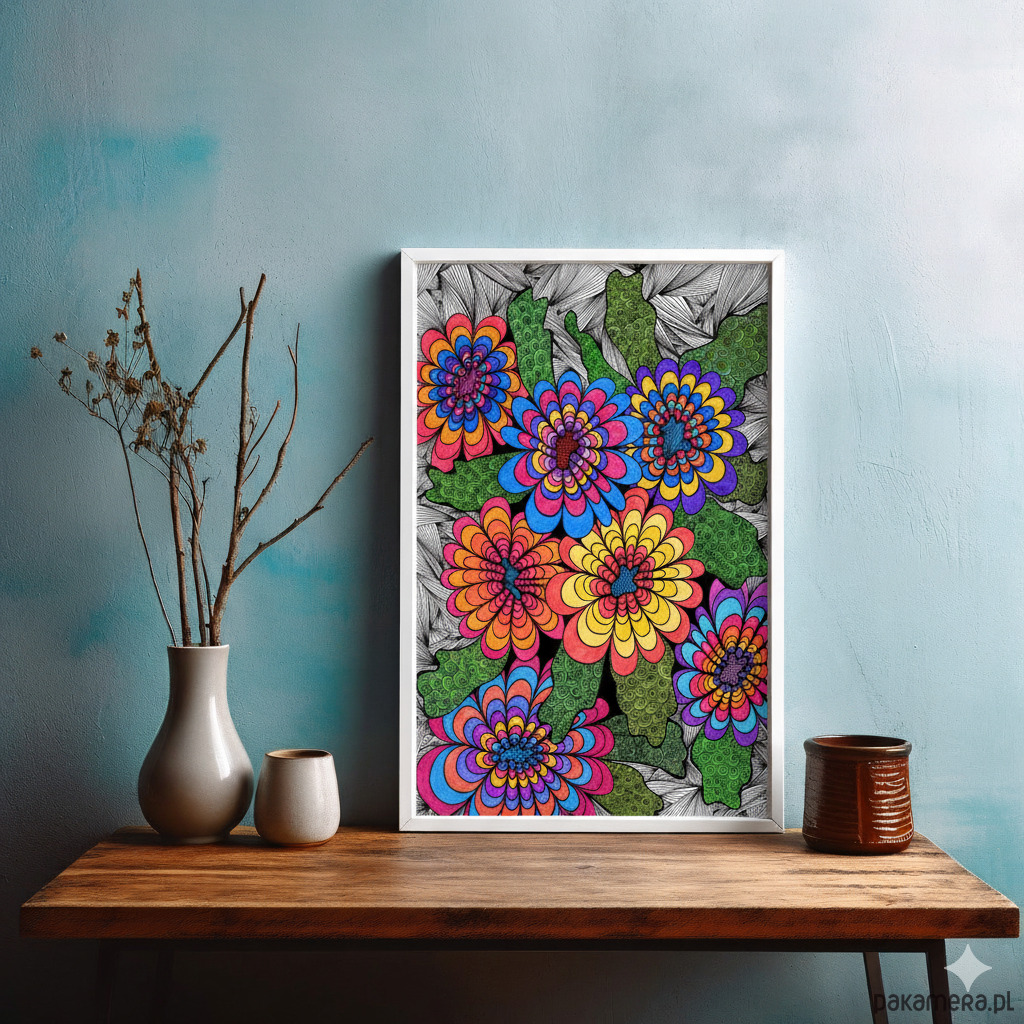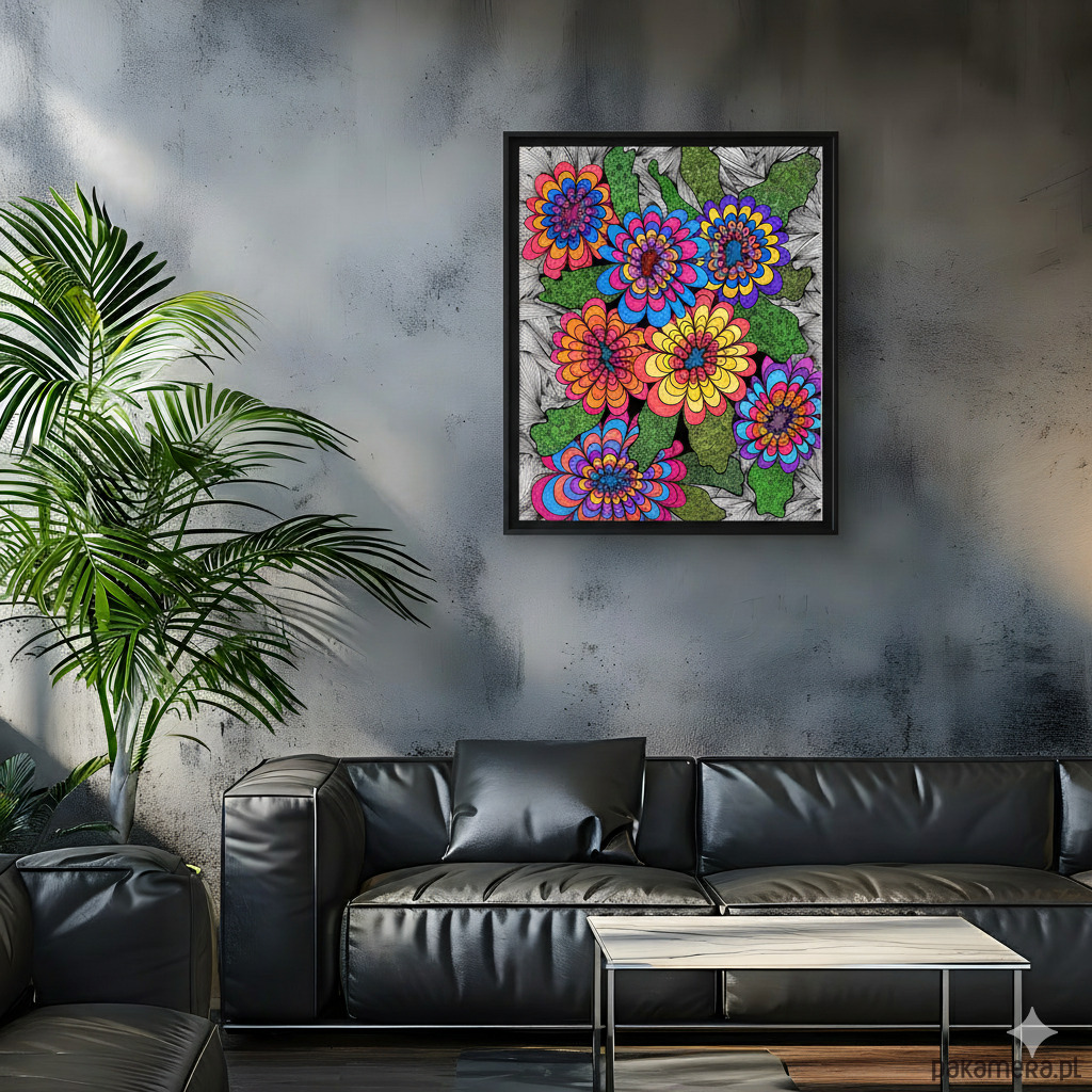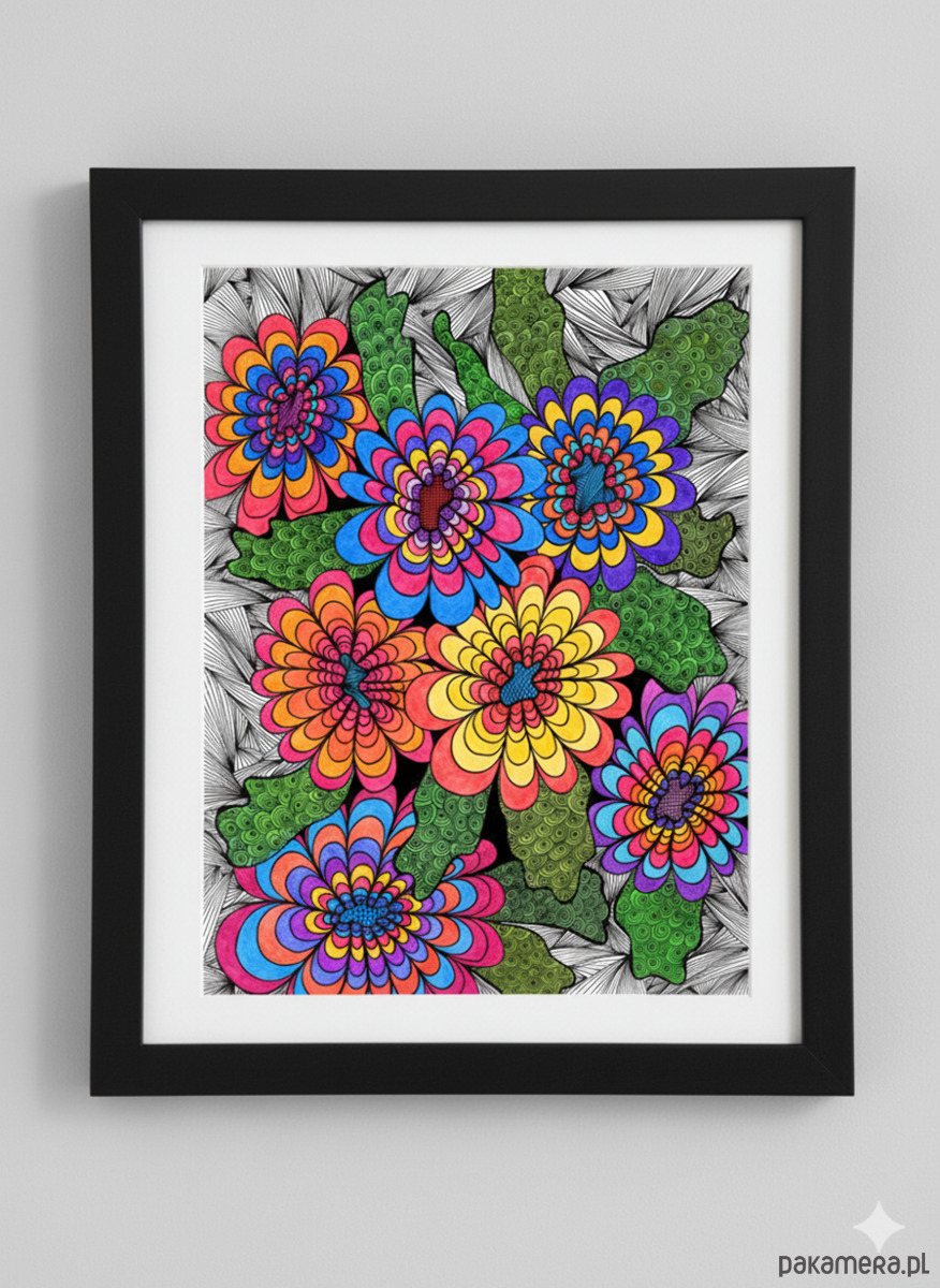 Intensywna, psychodeliczna ilustracja przedstawiająca grupę siedmiu stylizowanych kwiatów, ułożonych ciasno na pierwszym planie. Każdy kwiat charakteryzuje się kontrastowymi, nasyconymi kolorami (błękit, żółć, pomarańcz, purpura, róż), co tworzy efekt wibrującej optycznie feerii barw. Kwiaty otoczone są zielonymi liśćmi wypełnionymi organicznymi spiralnymi wzorami. Całość osadzona jest na gęstym, czarno-białym tle z promieniście rozchodzącymi się liniami, co potęguje wrażenie eksplozji, dynamiki i czystej, nieokiełznanej radości.