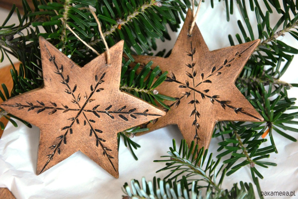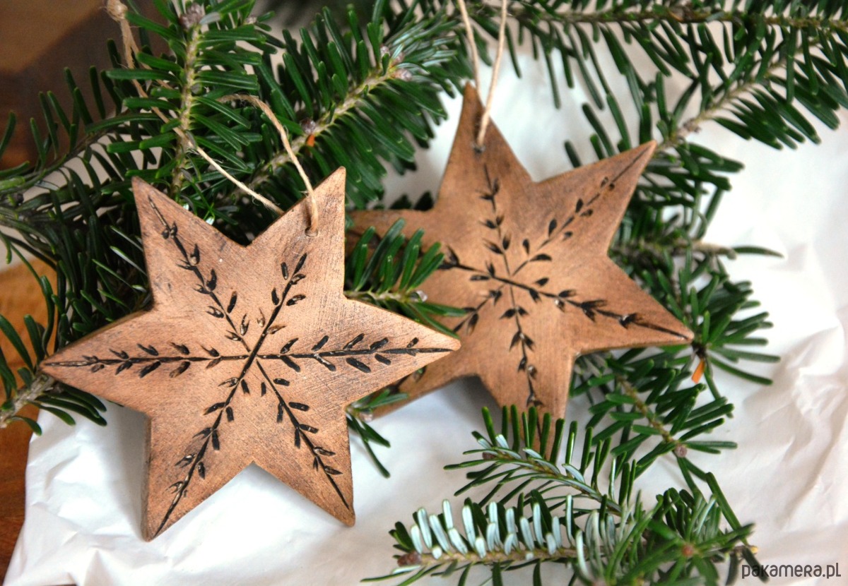 3 ceramiczne gwiazdki ręcznie formowane, nie szkliwione. Posiadają zawieszki. Wys.9 cm.