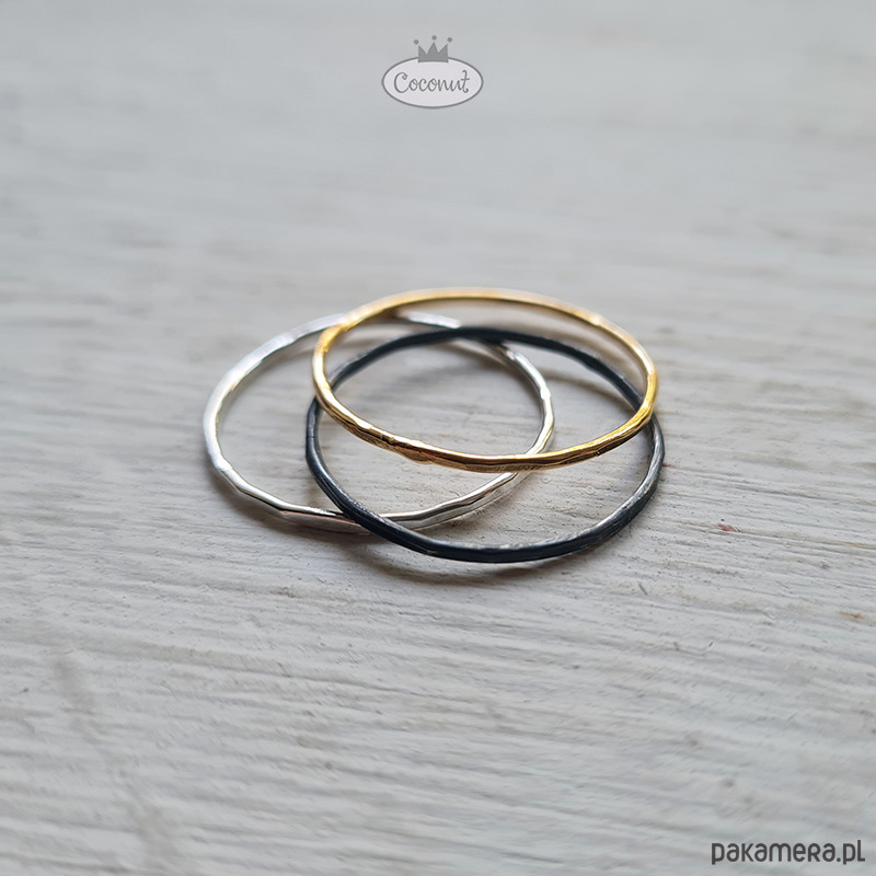 Komplet trzech cienkich obrączek ze srebra, srebra oksydowanego i mosiądzu, o szerokości ok. 1 mm, po zakupie prosimy podać rozmiar.