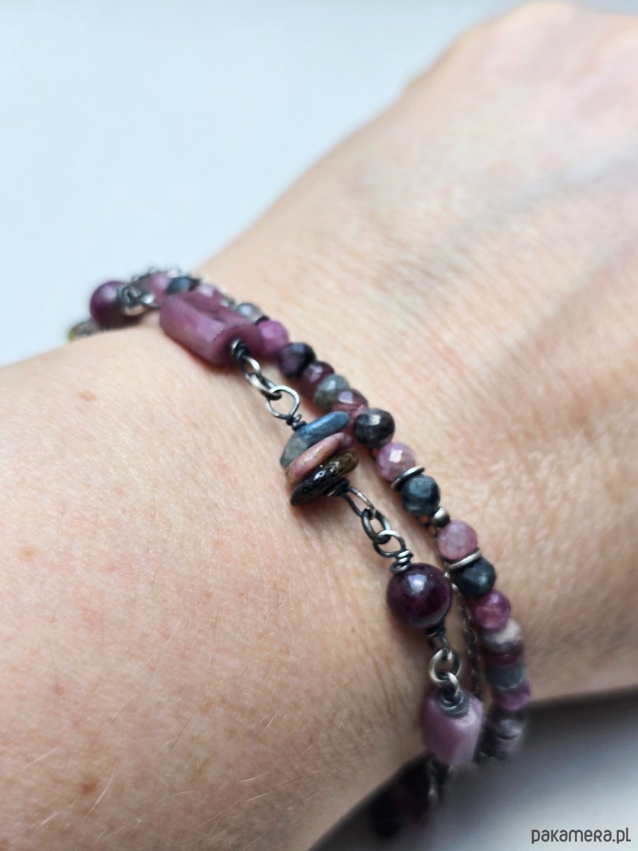 Potrójna, wyjątkowa bransoletka z zawieszkami. Wykonana z kolorowych turmalinów w różnych kształtach.