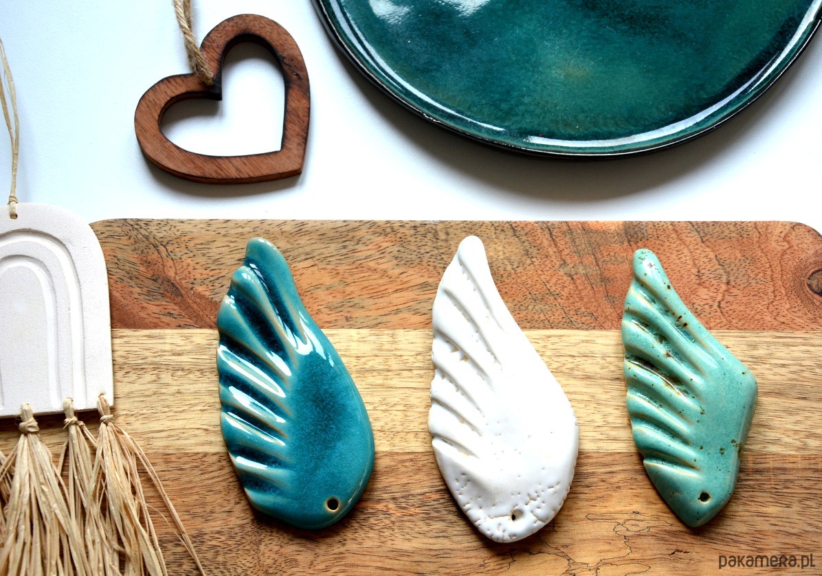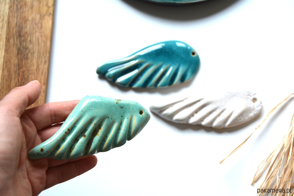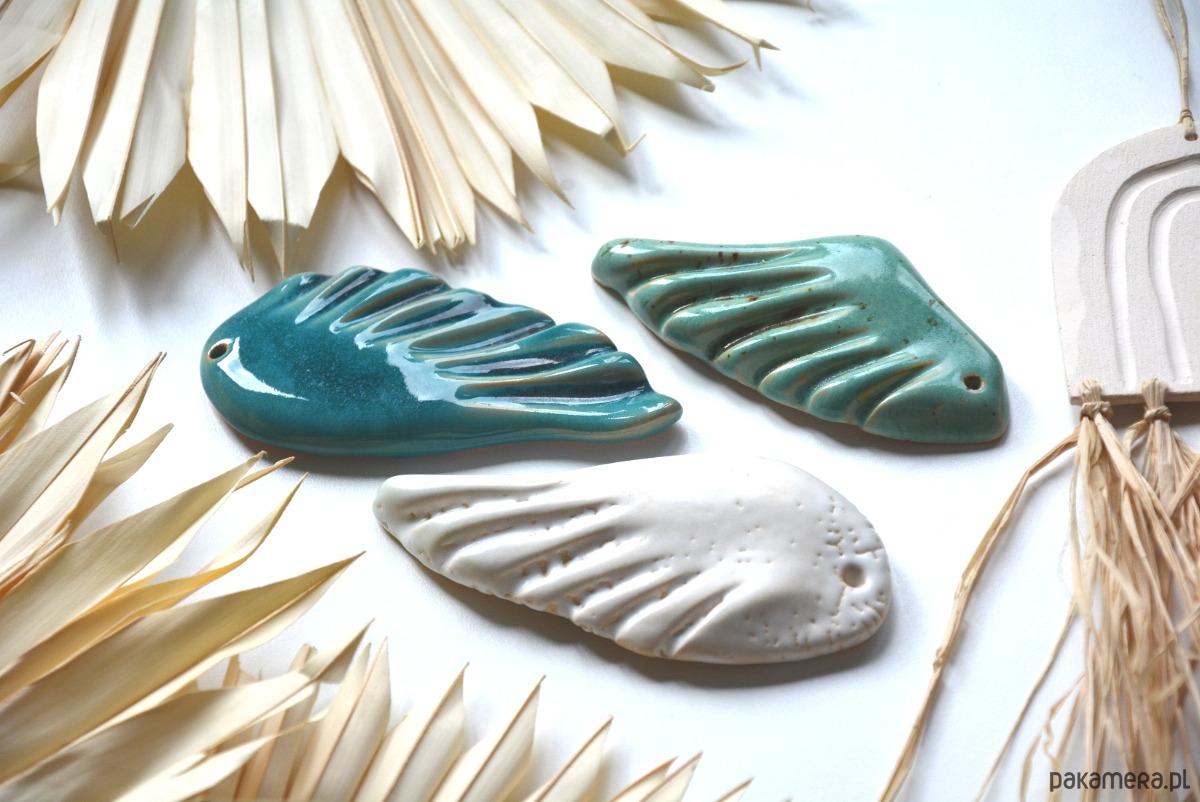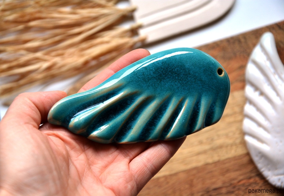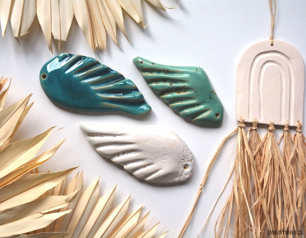 Zestaw 3 skrzydeł ceramicznych, ręcznie formowanych. Dekoracja szkliwiona w 3 kolorach: morski, biały, niebieski. Dekoracja nie jest zawieszką.