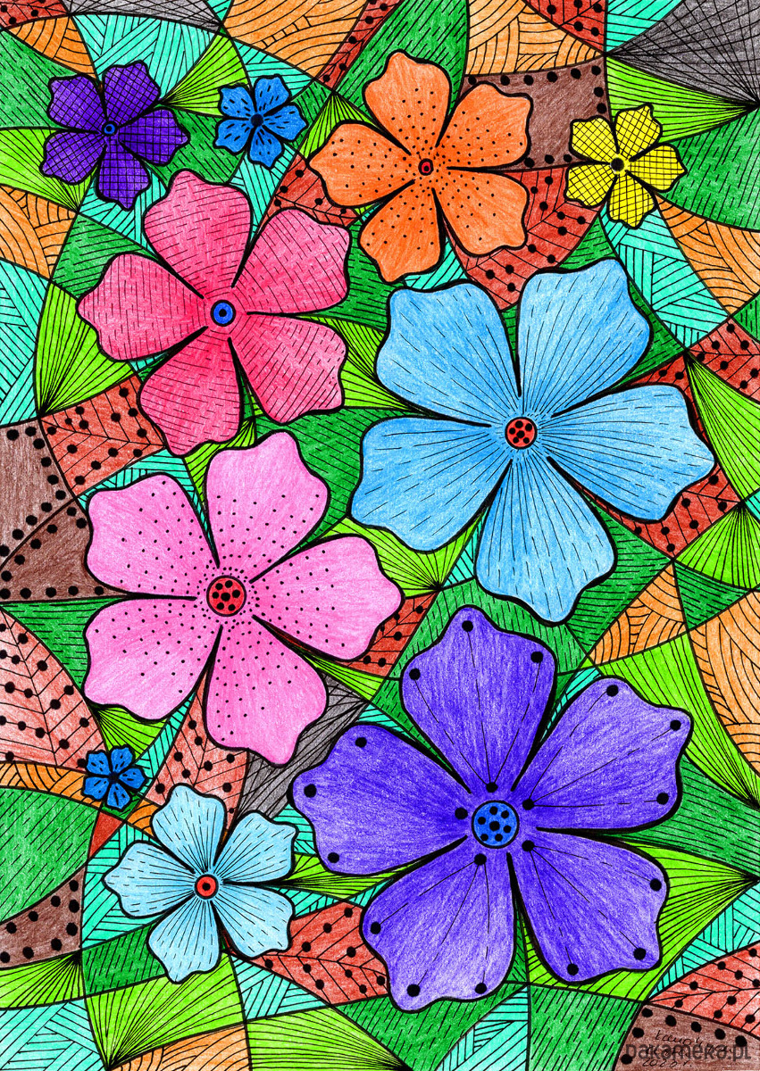 Radosna, wielobarwna ilustracja botaniczna przedstawiająca grupę stylizowanych kwiatów o pięciu płatkach w różnorodnych kolorach. Kwiaty są osadzone na geometrycznym, fragmentarycznym tle wypełnionym kontrastowymi, liniowymi i punktowymi wzorami (zentangle) w odcieniach brązu, zieleni i terakoty. Rysunek charakteryzuje się silnym kontrastem między gładkimi, wyrazistymi kwiatami a złożonym, geometrycznym tłem, co nadaje mu wibrujący, dekoracyjny charakter.