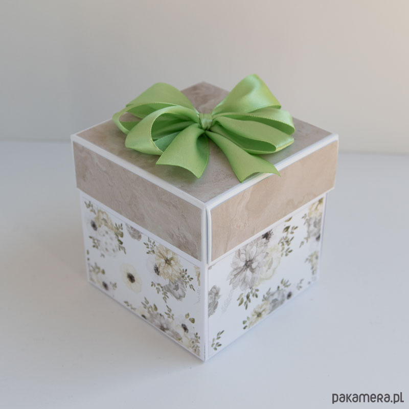 Na środku pudełeczka znajduje się dekoracja z papierowymi kwiatuszkami, na ściankach motyw serca, życzenia dla solenizantów, miejsce na podpis oraz dwie podkowy na szczęście.