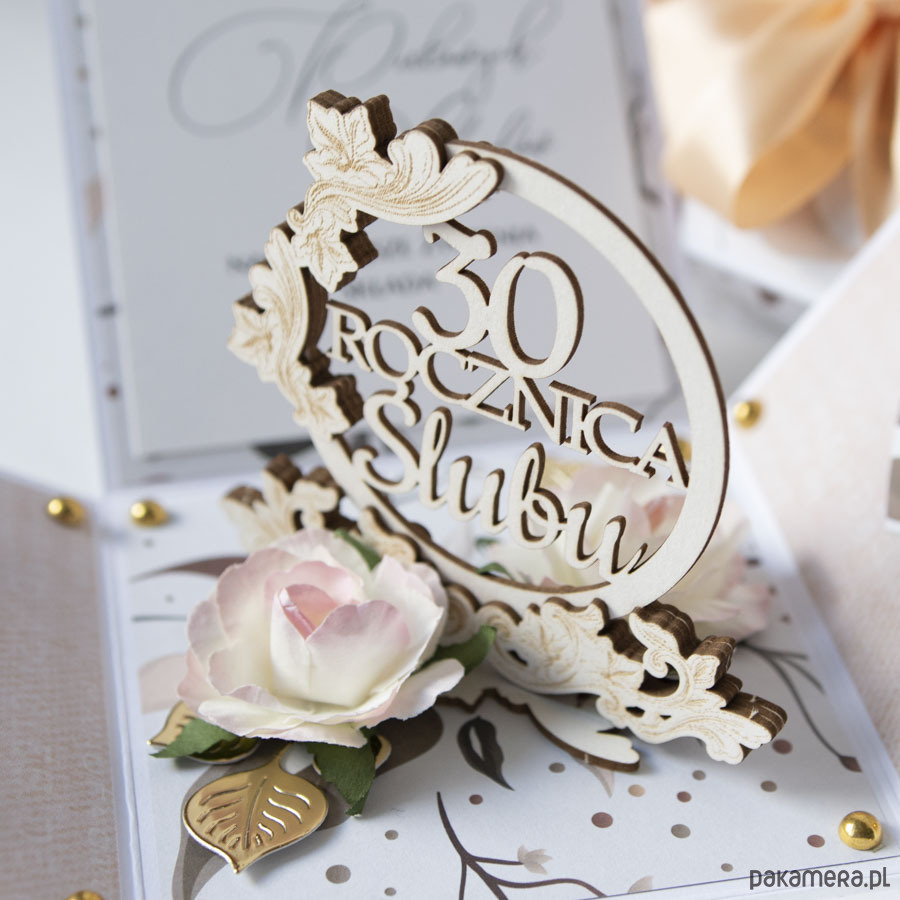 Ręcznie robiona kartka z okazji 30 rocznicy ślubu w formie rozkładanego pudełeczka.