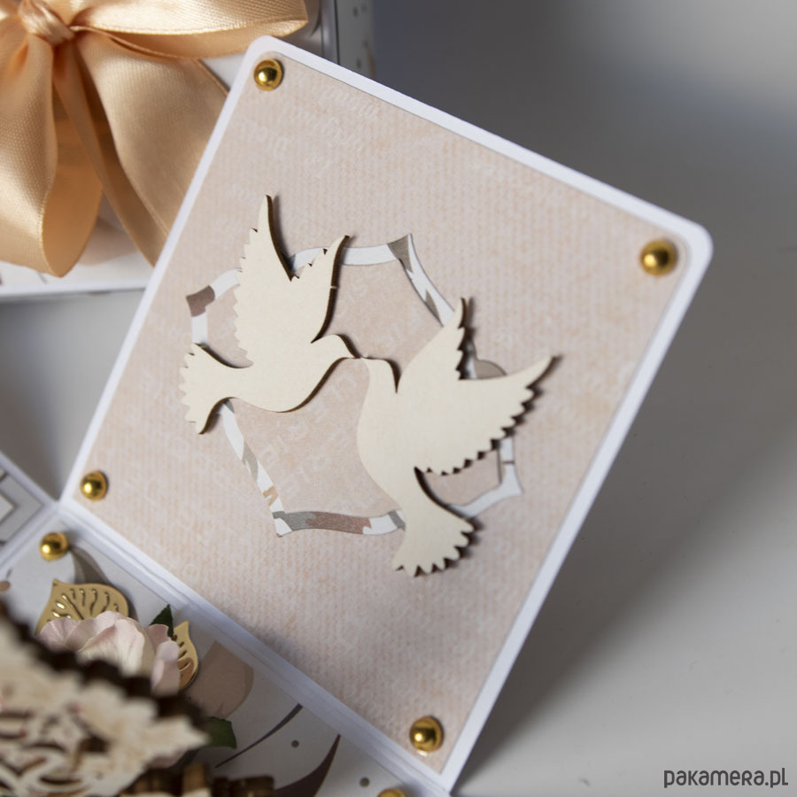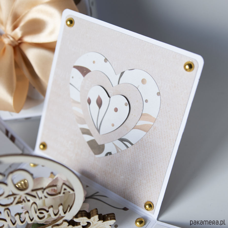 Na środku pudełeczka znajduje się dekoracja z papierowymi kwiatuszkami, na ściankach motyw serca, życzenia dla solenizantów, miejsce na podpis oraz dwia gołąbki.