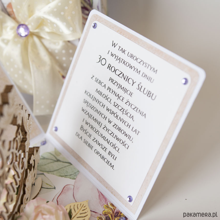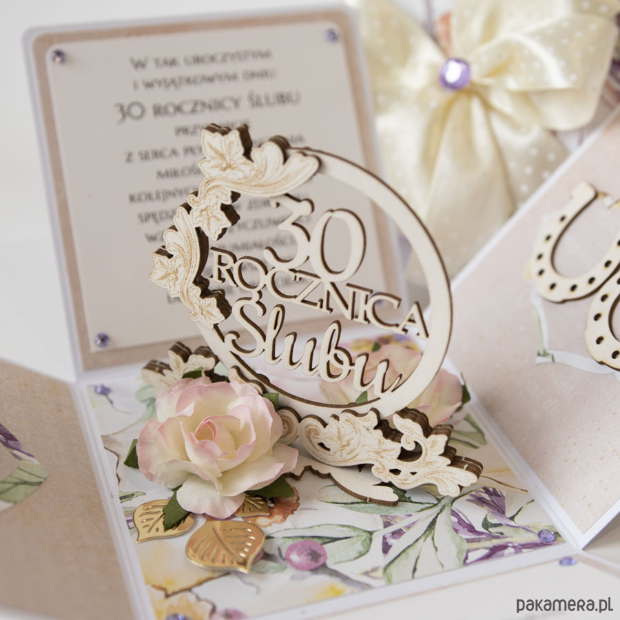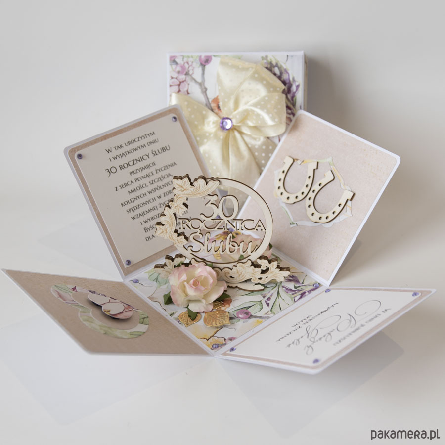 Ręcznie robiona kartka z okazji 30 rocznicy ślubu w formie rozkładanego pudełeczka.