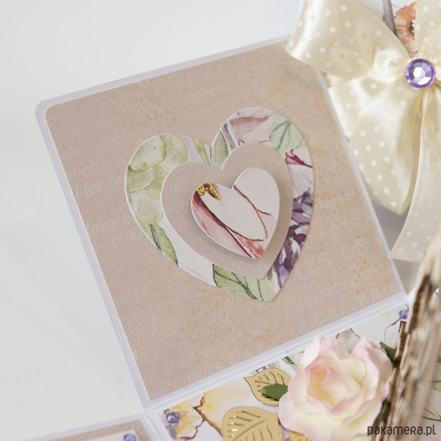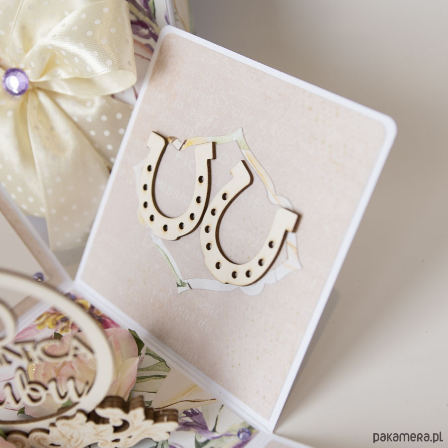 Na środku pudełeczka znajduje się dekoracja z papierowymi kwiatuszkami, na ściankach motyw serca, życzenia dla solenizantów, miejsce na podpis oraz dwie podkowy na szczęście.
