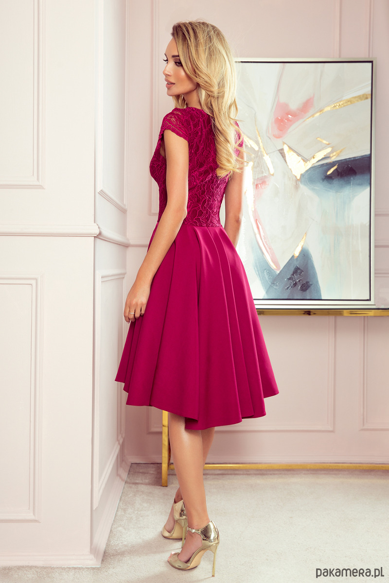 300-4 PATRICIA - sukienka z dłuższym tyłem i koronkowym dekoltem - BORDOWA