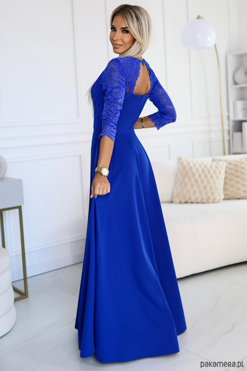 309-12 AMBER elegancka długa koronkowa suknia z dekoltem - chabrowa