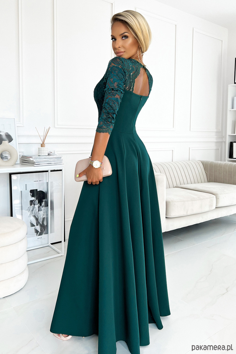 309-5 AMBER elegancka koronkowa długa suknia z dekoltem - ZIELEŃ BUTELKOWA