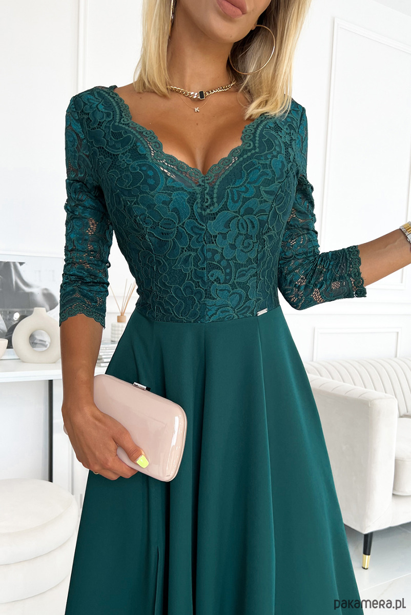 Amber - elegancka, długa, koronkowa, maxi suknia z dekoltem. Pięknie wyprofilowany dekolt i rozcięcie na spódnicy tworzy niecodzienną kreację w kolorze zieleni butelkowej. Produkcja polska. Marka Numoco.
