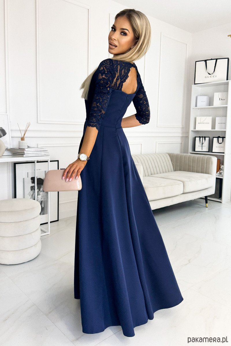 309-6 AMBER elegancka koronkowa długa suknia z dekoltem - GRANATOWA