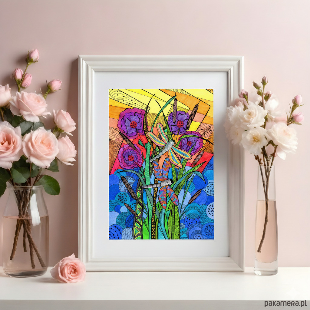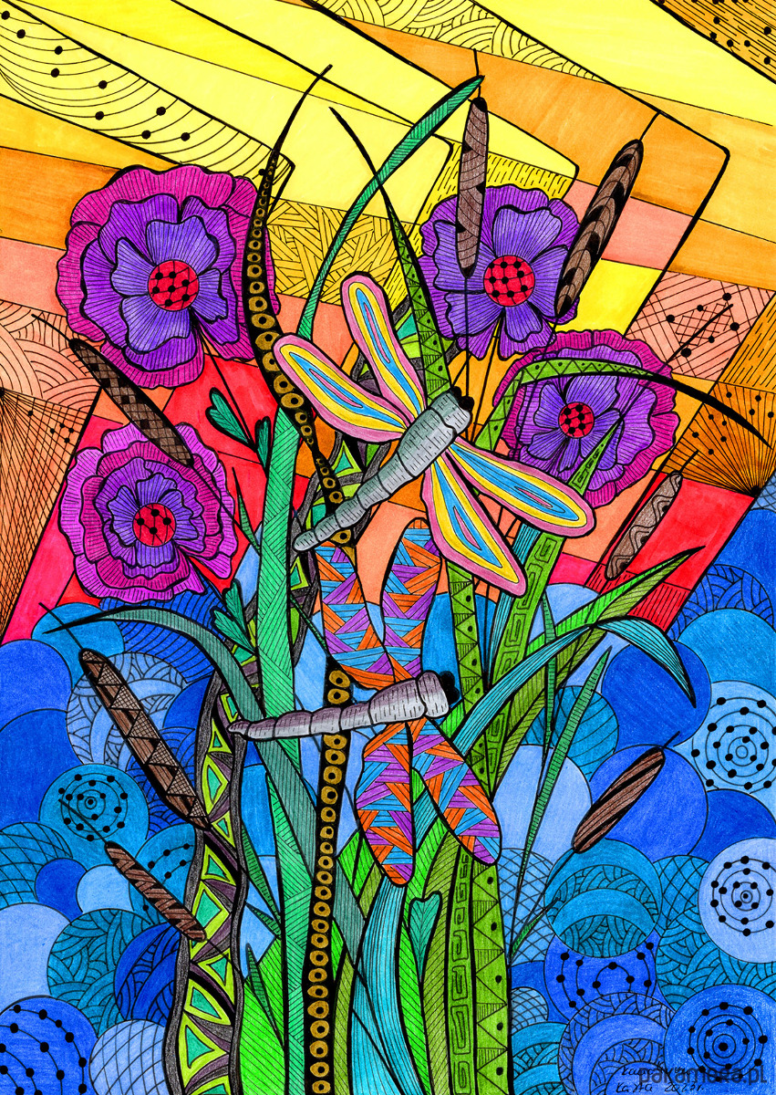 Intensywna, barwna ilustracja przedstawiająca scenę nad wodą. Kompozycja zdominowana jest przez bujne, stylizowane trzciny (pałki wodne), kwiaty o purpurowych płatkach oraz dwie geometrycznie stylizowane ważki o jaskrawo ubarwionych ciałach. Woda i niebo (tło) są wypełnione gęstymi, hipnotycznymi wzorami liniowymi (spirale, linie, zygzaki) w odcieniach błękitu, żółci i czerwieni, co nadaje całości wibrujący, psychodeliczny charakter, symbolizujący dynamiczne, eteryczne życie.