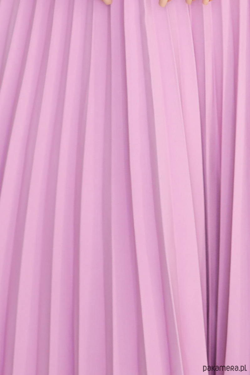 Lila – elegancka plisowana sukienka midi w kolorze wrzosu to idealny wybór dla kobiet ceniących styl i wygodę. Uszyta z lekkiego, plisowanego materiału, pięknie układa się na sylwetce, podkreślając jej atuty. Pasek, który można zawiązać w kokardę, dodaje romantycznego akcentu i podkreśla talię. Krótki rękawek zapewnia swobodę ruchów, a kryty zamek z tyłu gwarantuje idealne dopasowanie. Doskonała na eleganckie wyjścia, letnie przyjęcia i rodzinne uroczystości. Produkt polski. Marka Numoco.