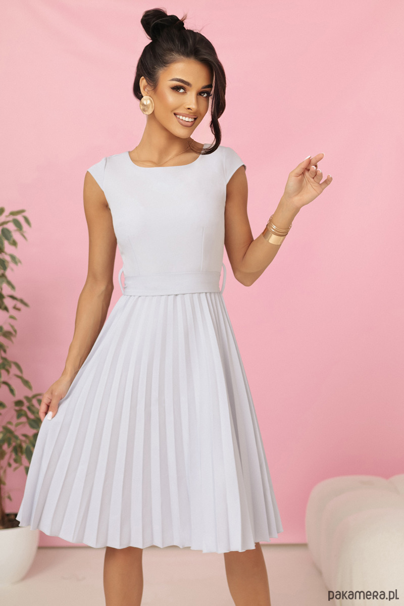 311-20 LILA Plisowana sukienka z krótkim rękawkiem i paskiem - SZARA