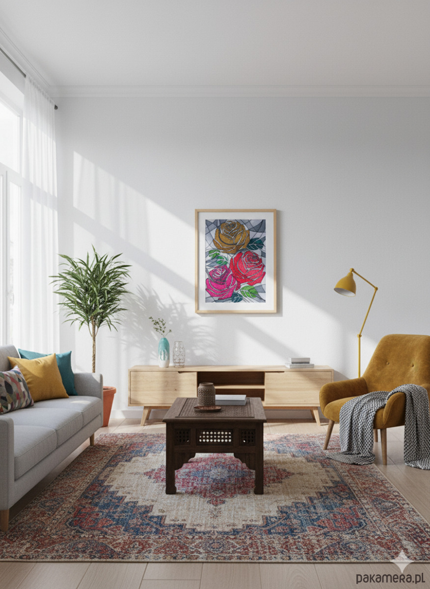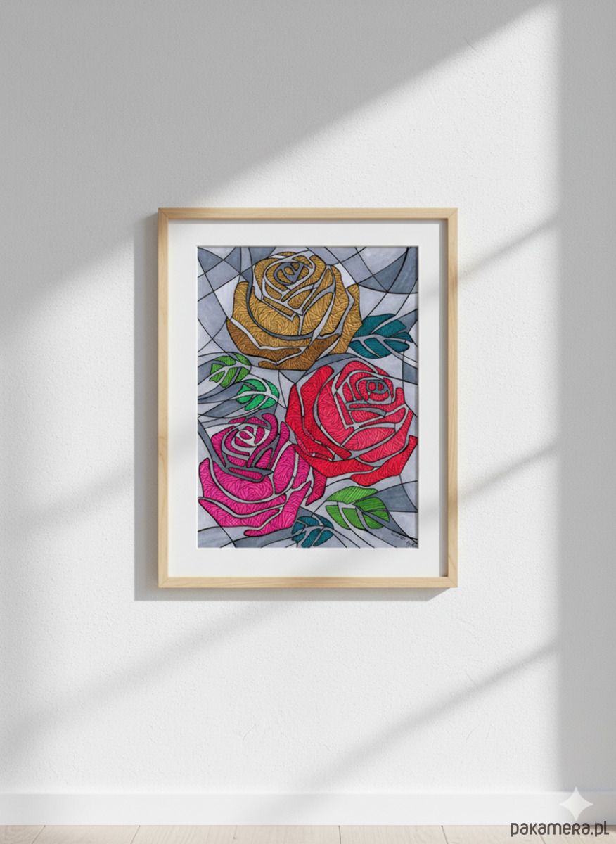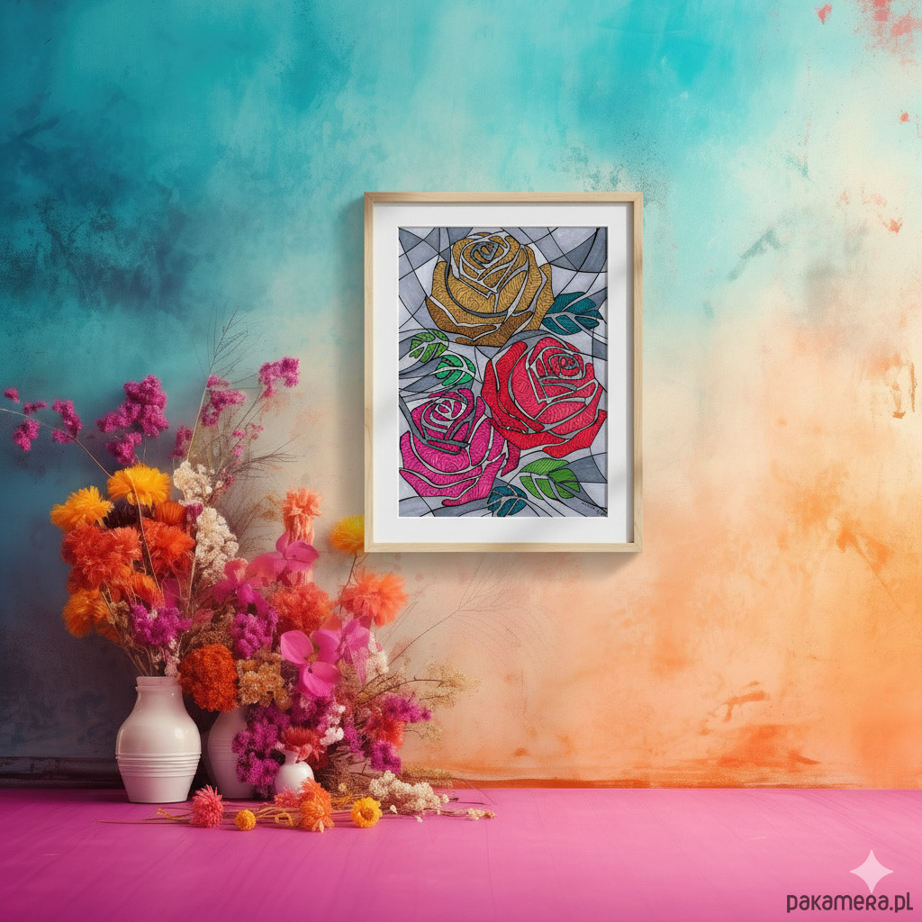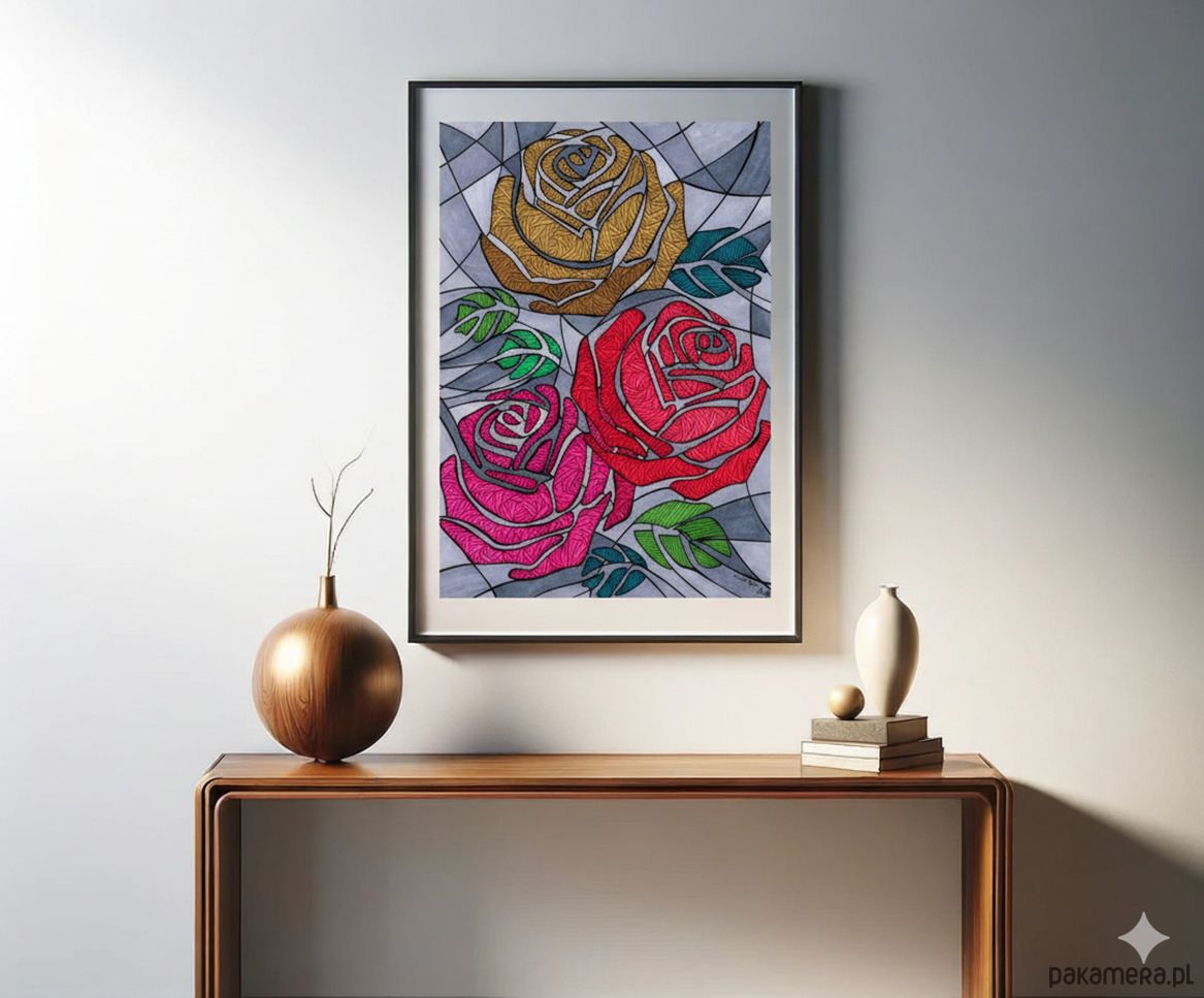 Mimo "szarego" tła, róże są pełne gęstych, wibrujących wzorów. To oznacza, że najsilniejsze emocje (pasja, szacunek, miłość) są ukryte wewnątrz i promieniują intensywną energią, nawet gdy otoczenie jest chłodne i logiczne.