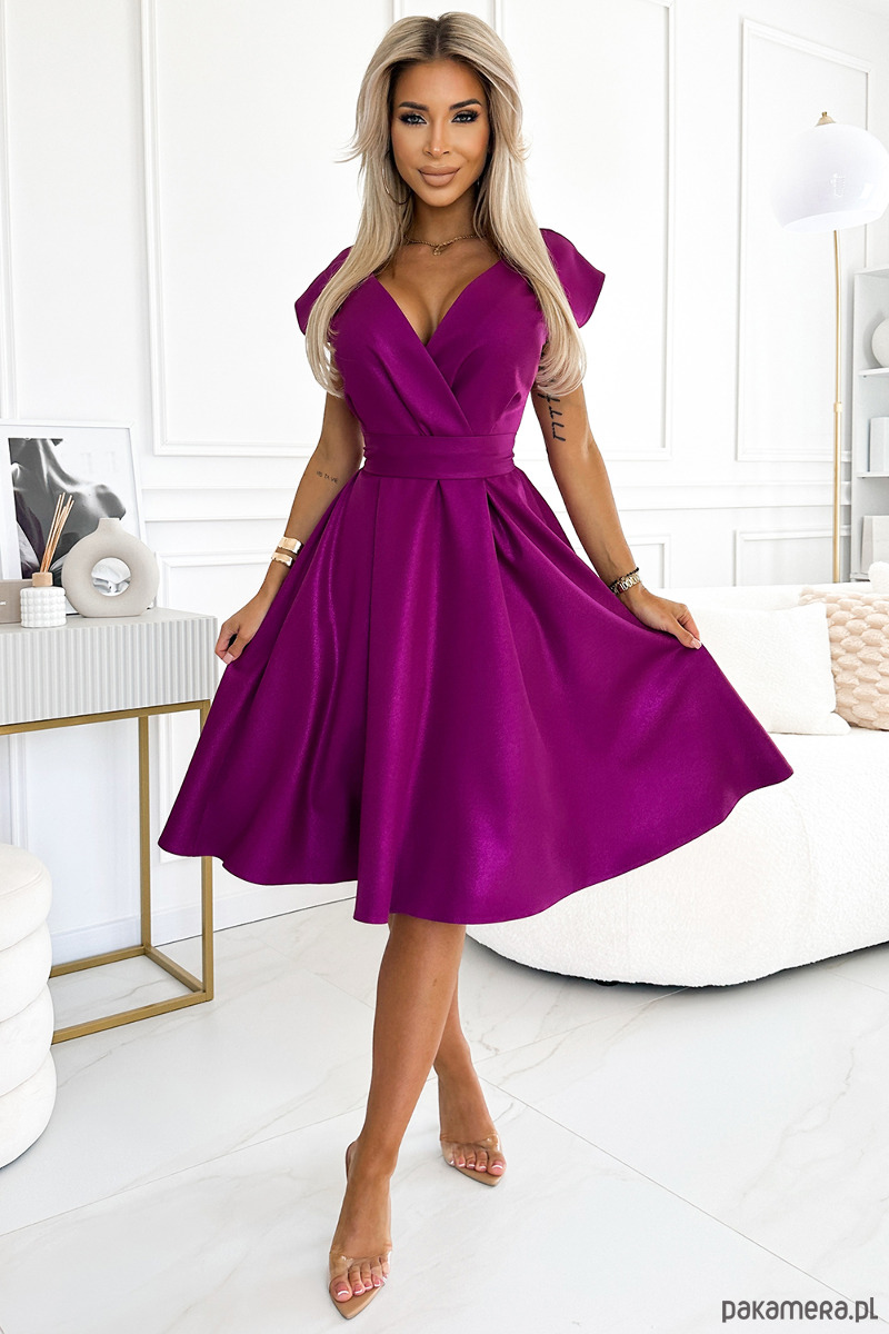 348-8 SCARLETT rozkloszowana sukienka z kopertowym dekoltem i paskiem - FUKSJA Z BROKATEM