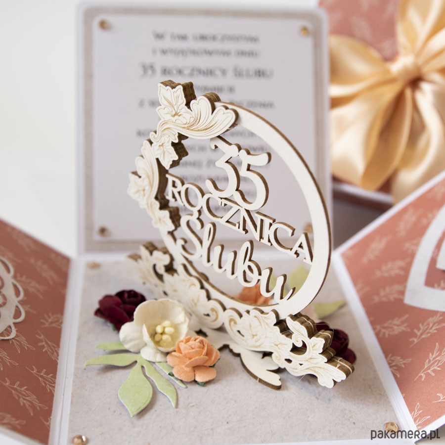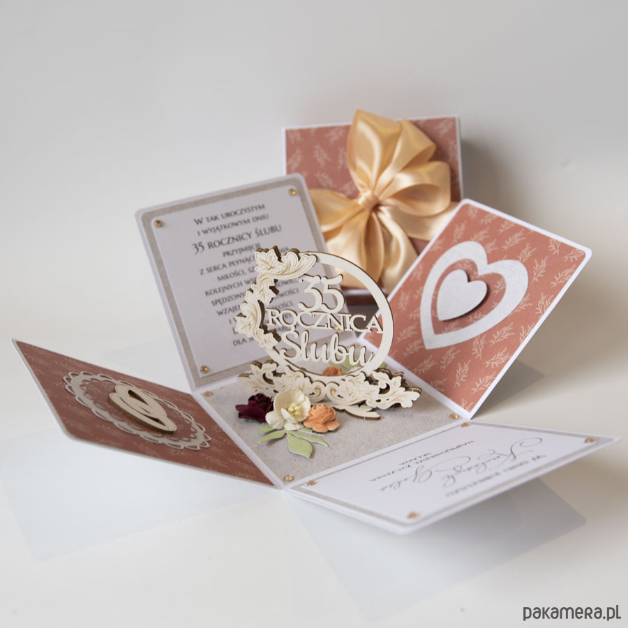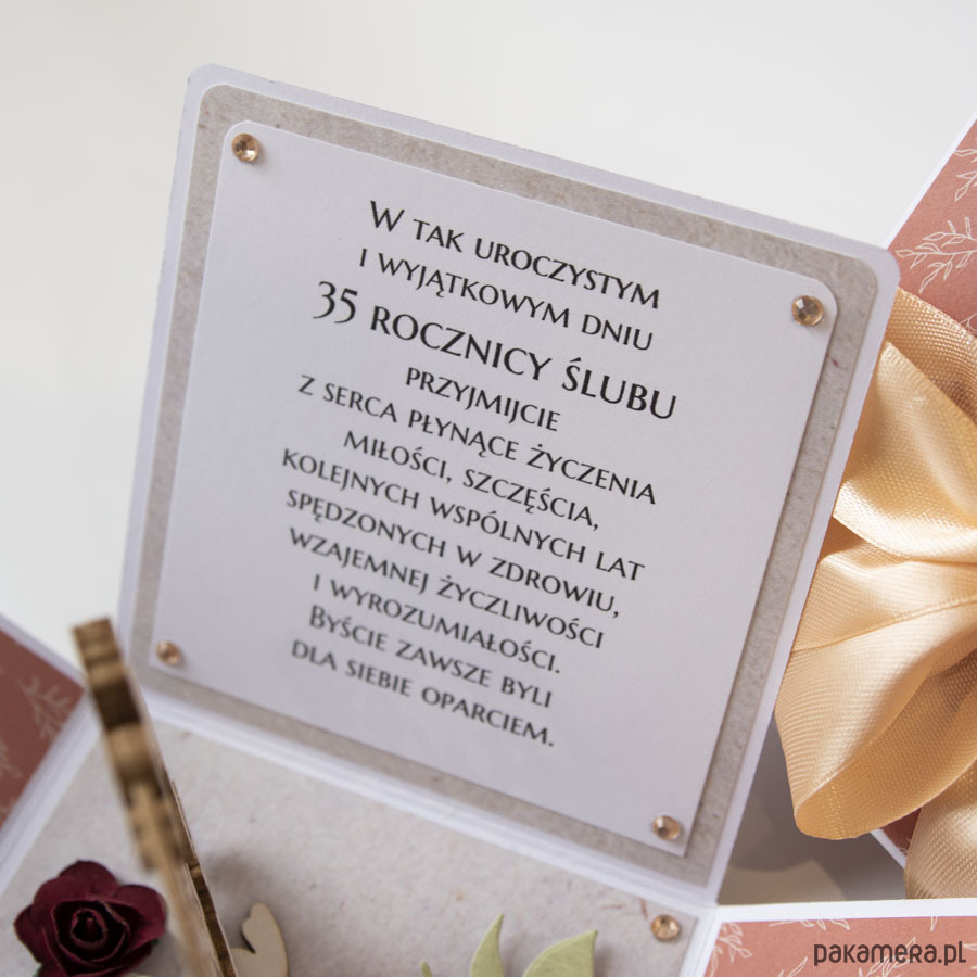 Ręcznie robiona kartka z okazji 35 rocznicy ślubu w formie rozkładanego pudełeczka.