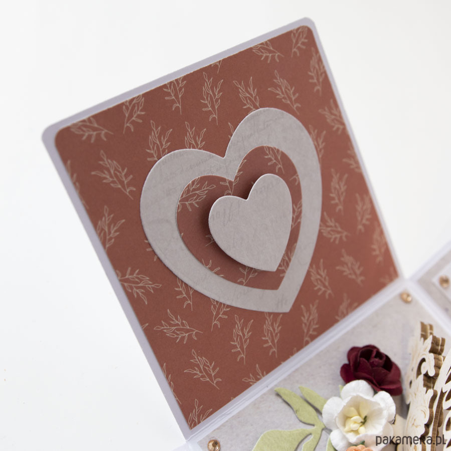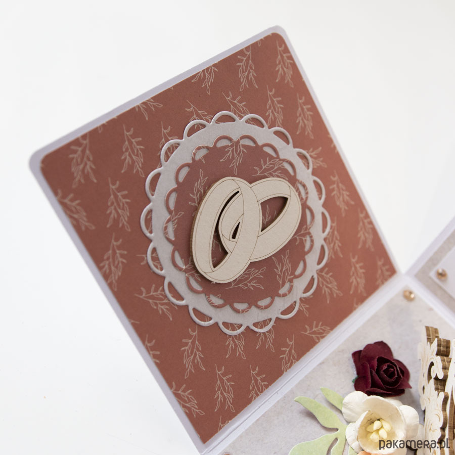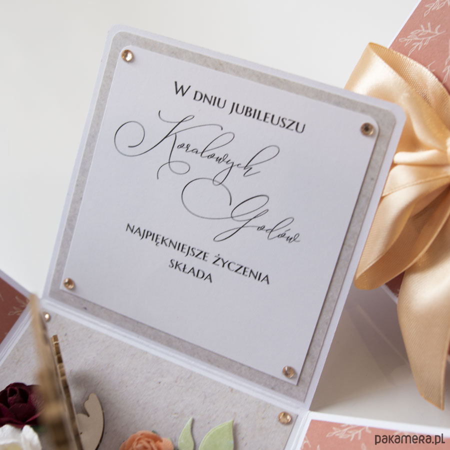 Na środku pudełeczka znajduje się dekoracja z papierowymi kwiatuszkami, na ściankach motyw serca, życzenia dla solenizantów, miejsce na podpis oraz splecione ze sobą obrączki.