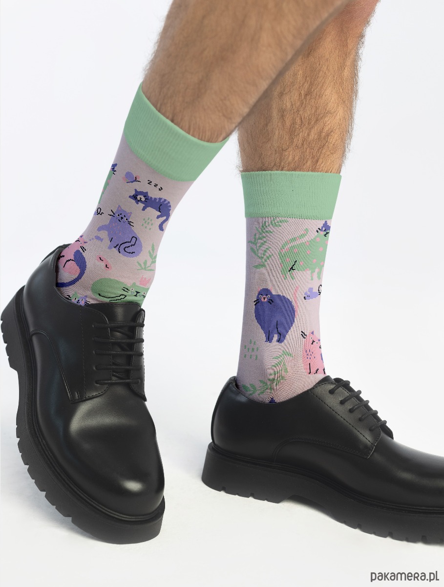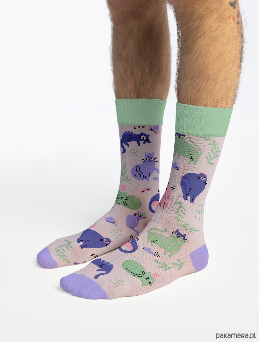 To modne skarpetki unisex – świetne zarówno jako skarpetki damskie w koty, jak i skarpetki męskie w koty. Jeśli szukasz oryginalnych skarpetek z kotami, kolorowych skarpetek, albo designerskich skarpetek w pastelach, model Funky Cats będzie strzałem w dziesiątkę.