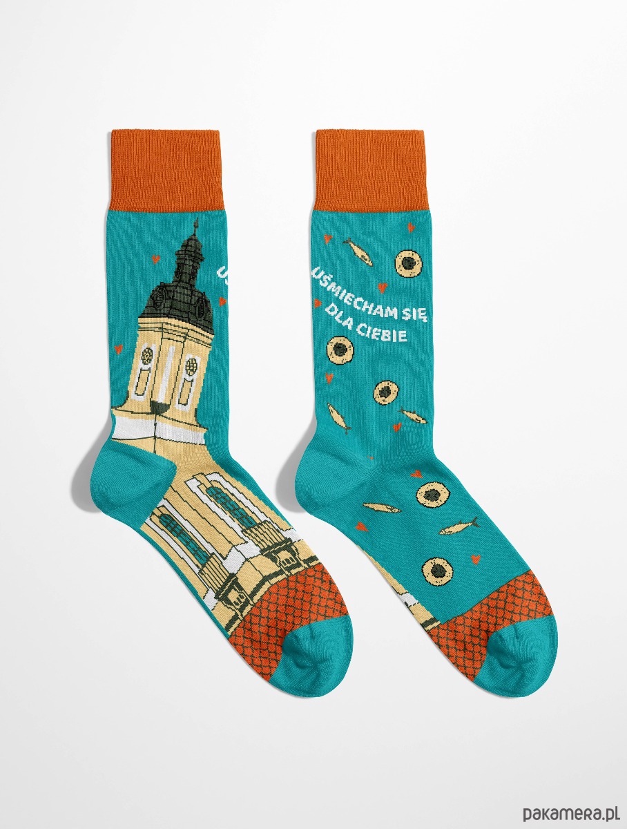 Skarpetki Uśmiechnięty Ratusz to wzór, który cieszy się wyjątkową popularnością. Tworząc wzór inspirowaliśmy się białostockim Ratuszem i lokalnym kolorytem. Na skarpetkach oprócz zabawnych śljedzików można dostrzec bułkę białys - dobrze znaną w przedwojennym Białymstoku a aktualnie zapomnianą :) Przyciągaj spojrzenia i wywołuj uśmiech nie tylko na swojej twarzy! Jesteście gotowi na skarpetkowy lokalny patriotyzm?
