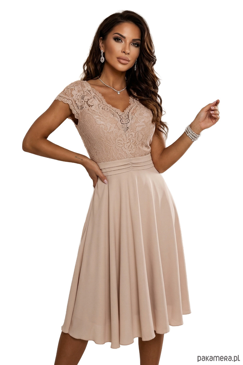 381-7 LINDA szyfonowa zwiewna sukienka z koronkowym dekoltem - beżowa