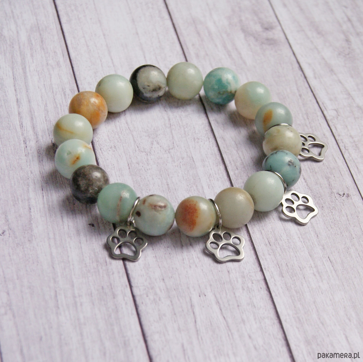 masywna, okazała bransoletka na solidnej lince elastycznej, wykonana z kul amazonitu (12mm); ozdobę stanowią zawieszki - - 4 łapki :) w całości wykonane ze stali szlachetnej (nie uczula, kolor nie ściera się)