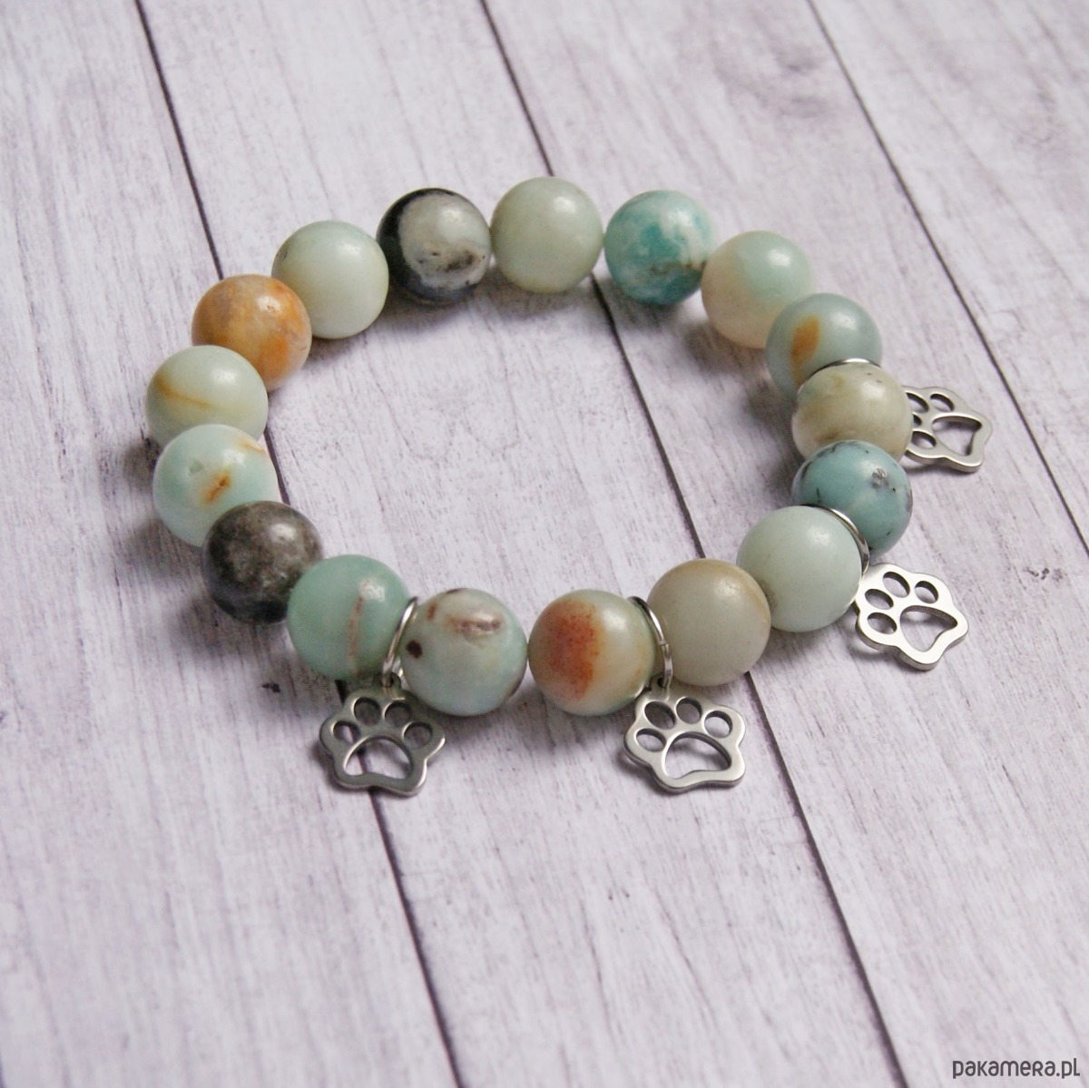 masywna, okazała bransoletka na solidnej lince elastycznej, wykonana z kul amazonitu (12mm); ozdobę stanowią zawieszki - - 4 łapki :) w całości wykonane ze stali szlachetnej (nie uczula, kolor nie ściera się)