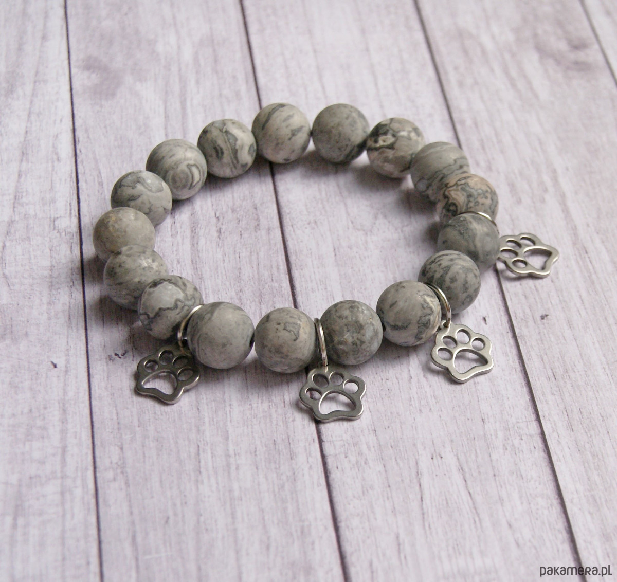 masywna, okazała bransoletka na solidnej lince elastycznej, wykonana z kul matowego jaspisu koronkowego (12mm); ozdobę stanowią zawieszki - - 4 łapki :) w całości wykonane ze stali szlachetnej (nie uczula, kolor nie ściera się)