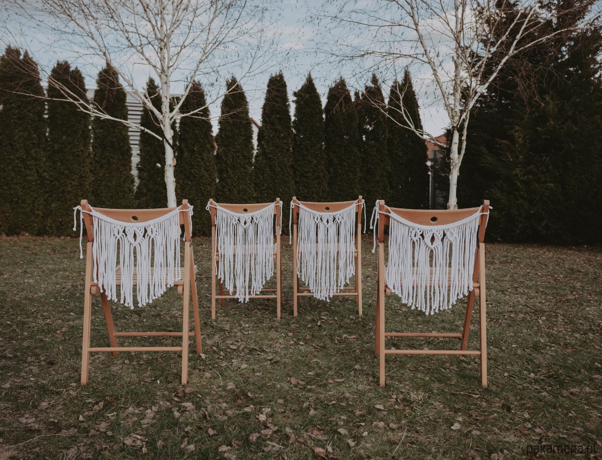 4 makramy na, krzesla.. Kolor biały.. Super na, ślub kościelny lub plenerowy.. Jak na zdjeciu..pasują na, każde krzesło (przywiązuje się sznureczkami) Dostępne od ręki! Cena za 4 sztuki
