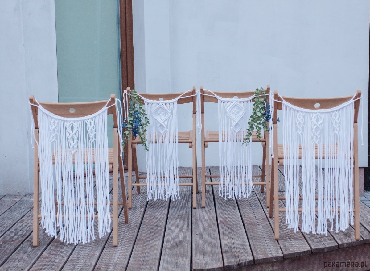 4 makramy ze sznurka bawełnianego w kolorze białym.. Śnieżnobiały .. Pasuje na każde krzesło..super na ślub w kościele lub plenerowy..wykonany ręcznie.. Super dekoracja boho .. . Polecam.. Dostępne od ręki!.. W razie dodatkowych pytań proszę pisać !