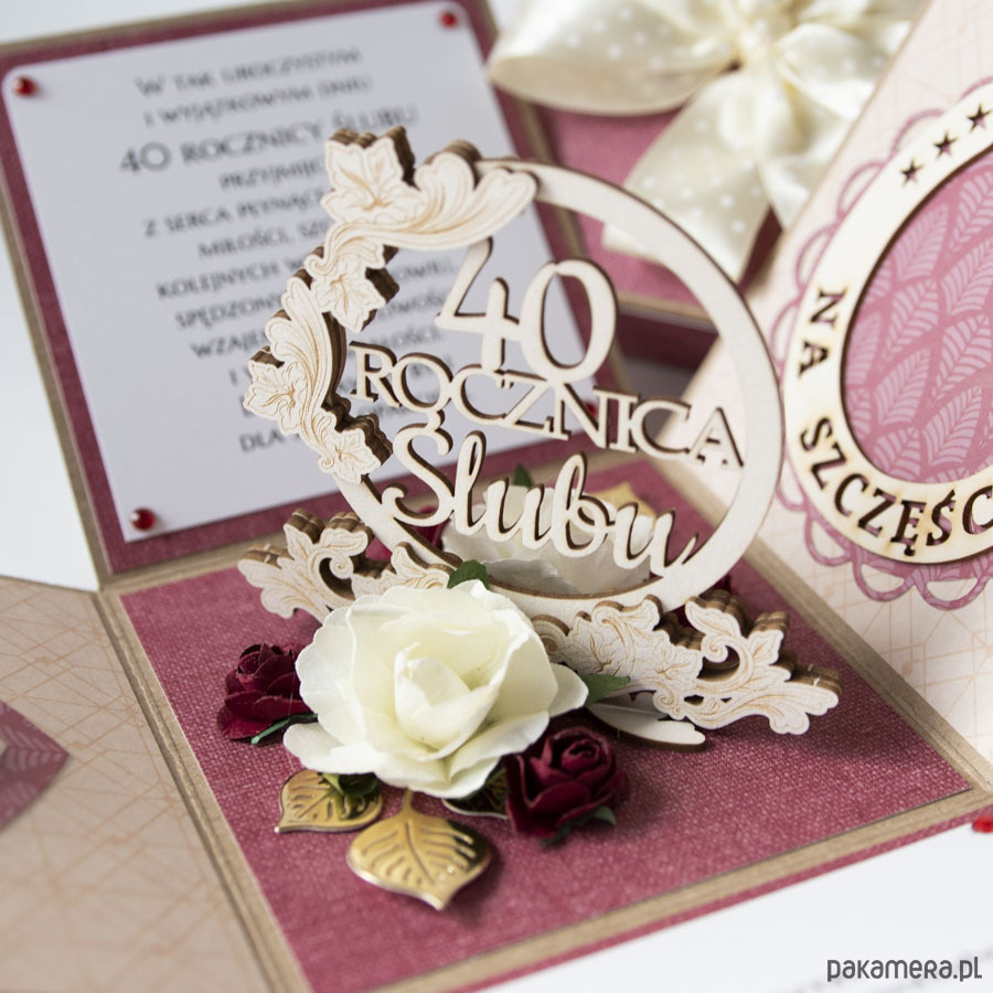 Ręcznie robiona kartka z okazji 40 rocznicy ślubu w formie rozkładanego pudełeczka.