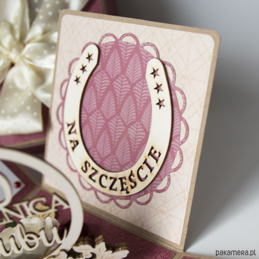 Na środku pudełeczka znajduje się dekoracja z papierowymi kwiatuszkami, na ściankach motyw serca, życzenia dla solenizantów, miejsce na podpis oraz splecione ze sobą obrączki.