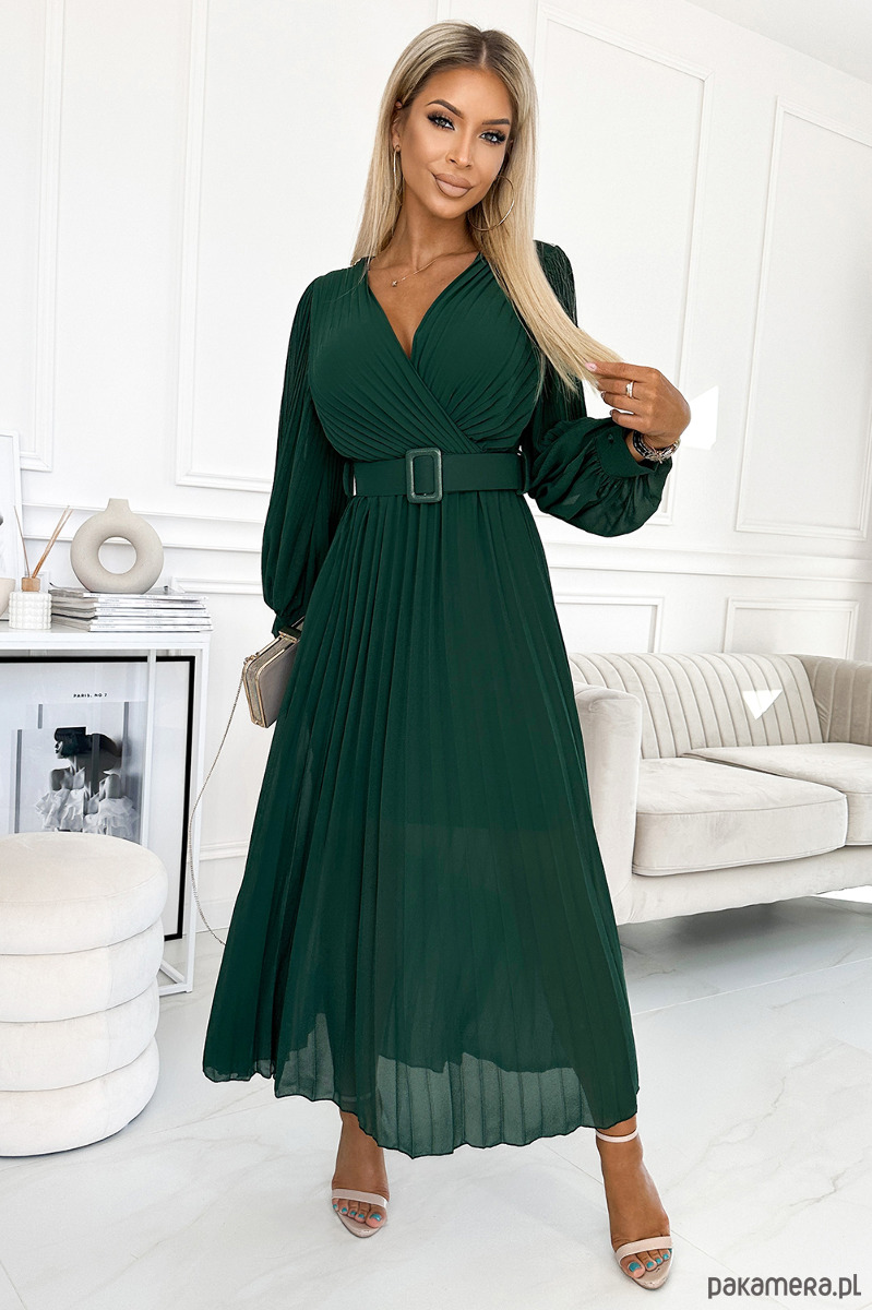 414-1 KLARA plisowana sukienka z paskiem i dekoltem - ZIELEŃ BUTELKOWA