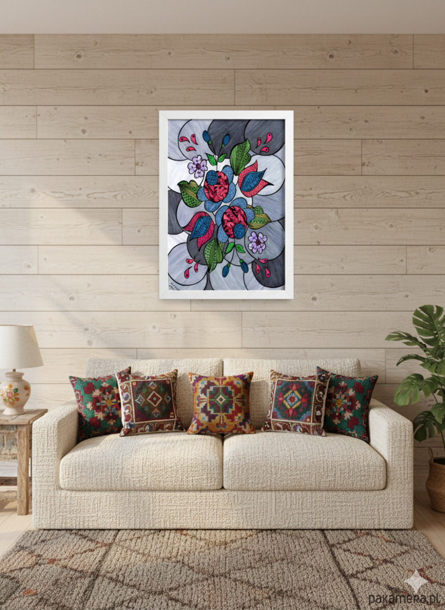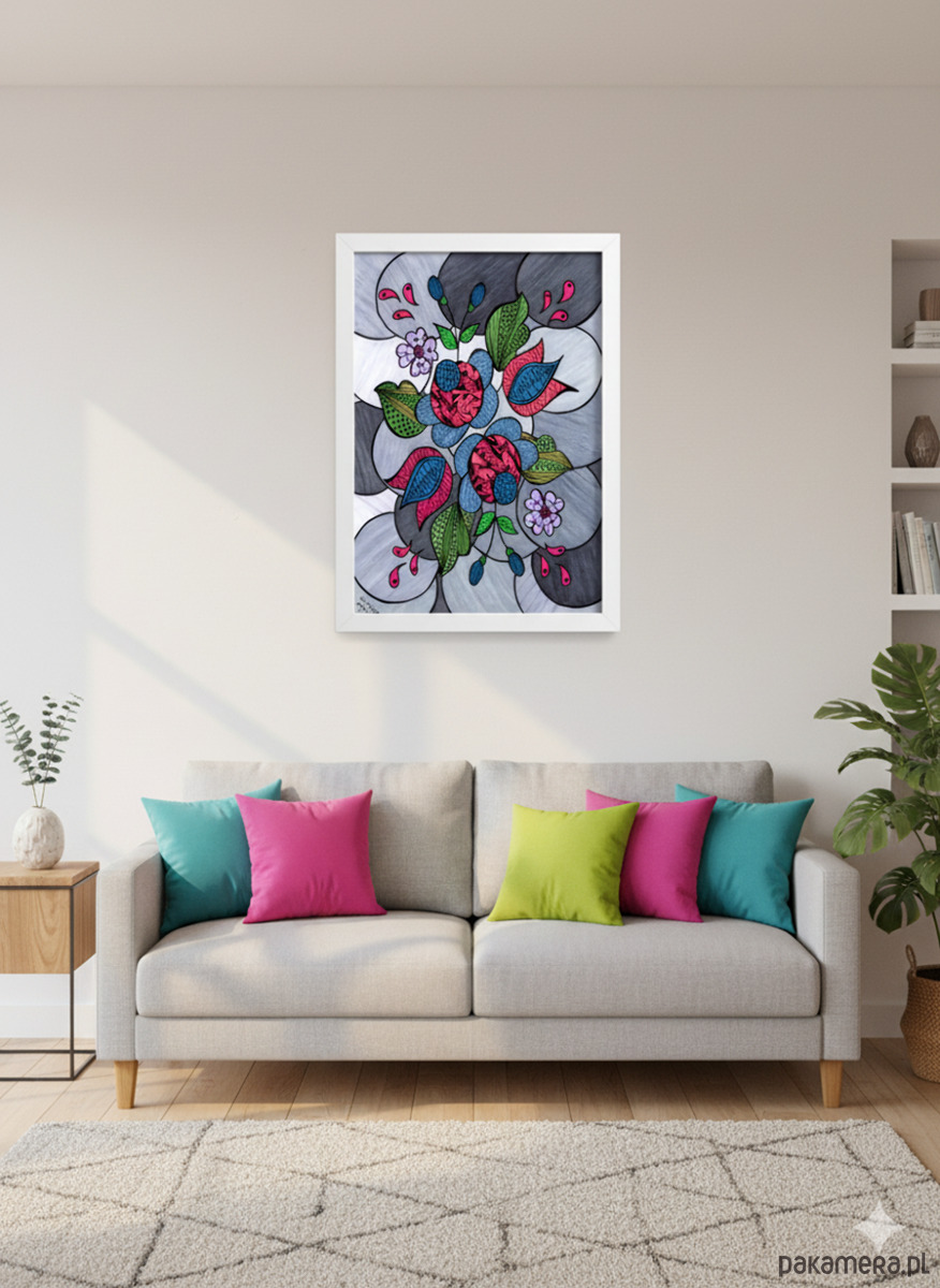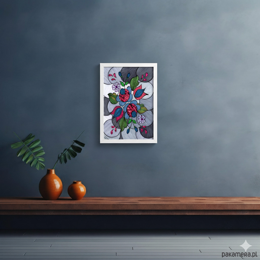 Dekoracyjna ilustracja przedstawiająca symetryczną kompozycję stylizowanych kwiatów, pąków i liści w kontrastowych kolorach. Rysunek łączy jaskrawy, stylizowany motyw roślinny z uporządkowanym, stonowanym tłem.