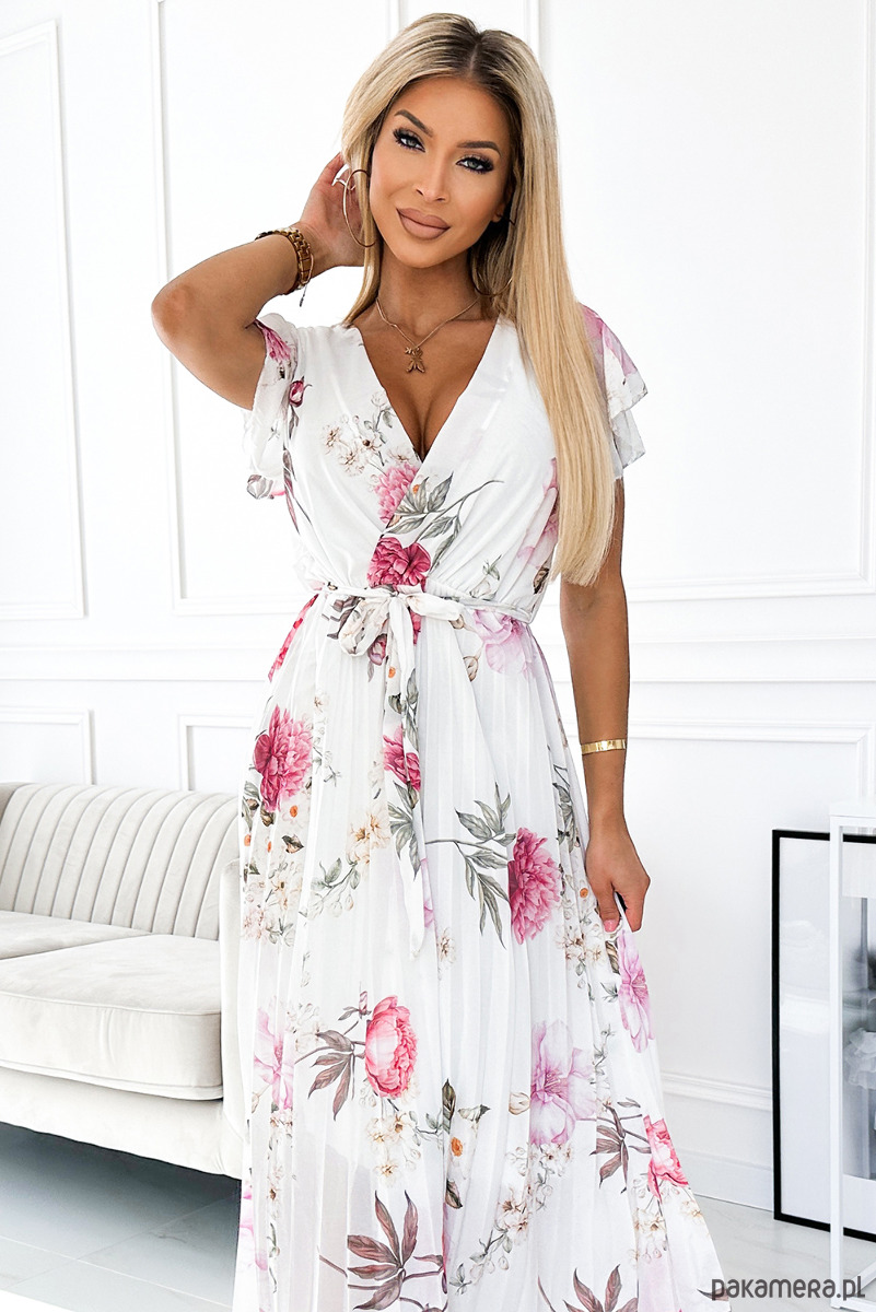 434-6 LISA Plisowana sukienka midi z dekoltem i falbankami - wiosenne kwiaty