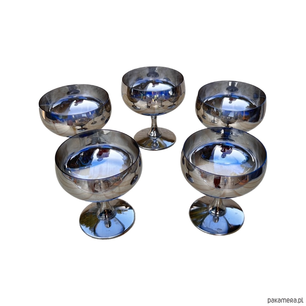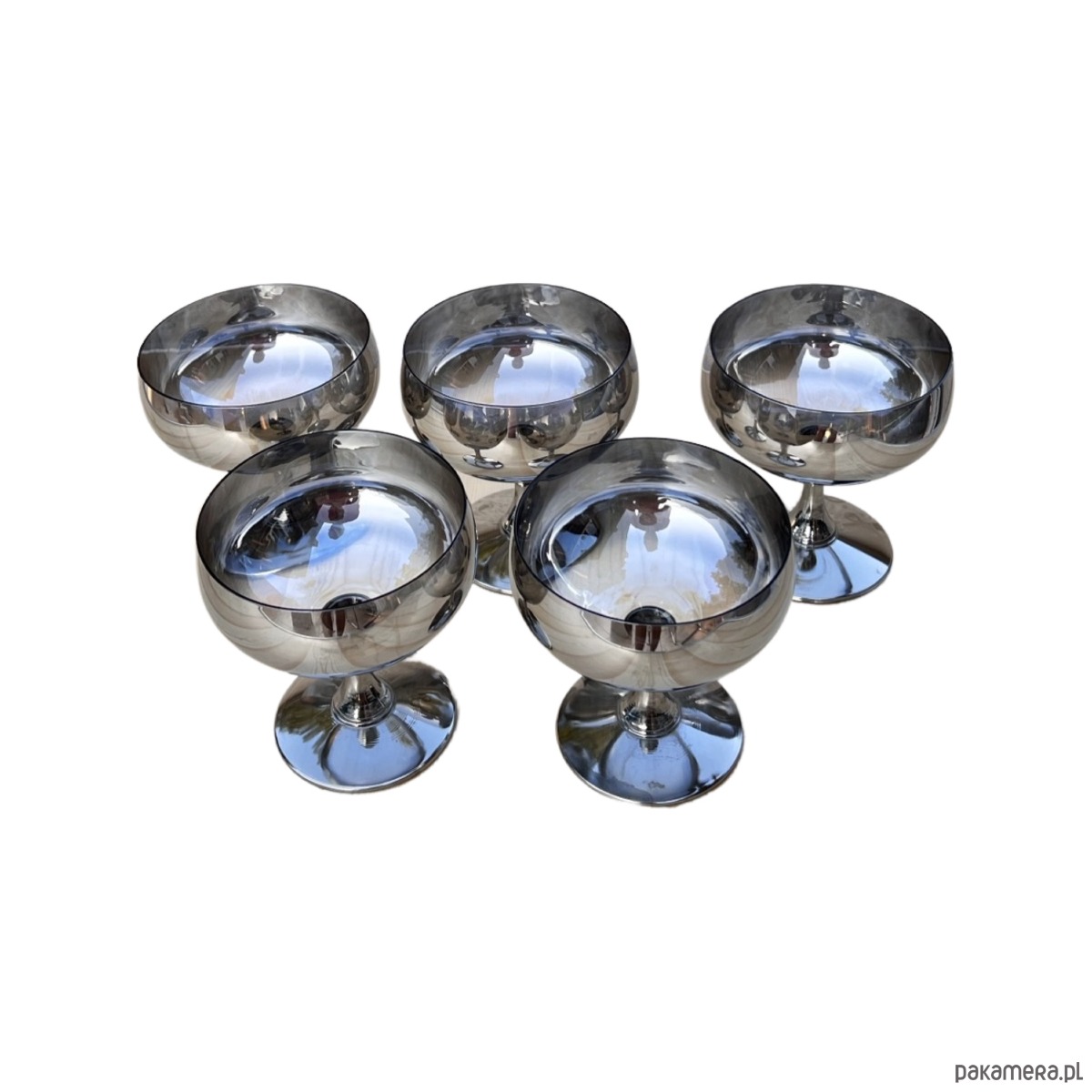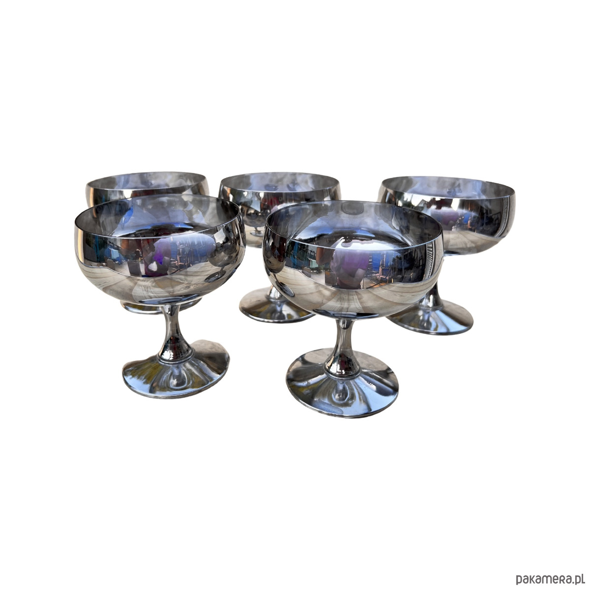 Komplet 5 szklanych ręcznie wykonanych kieliszków do szampana lub pucharków na lody wyprodukowanych we Polsce dla Huty Szkła Józefina w Krośnie w latach 80. Kieliszki do szampana o charakterystycznym, prostym kształcie - wykonane ze szkła srebrzonego, dymionego.Kieliszki w stanie oryginalnym bardzo dobrym z normalnymi śladami użytkowania. Wykonane z ręcznie zdobionego szkła.