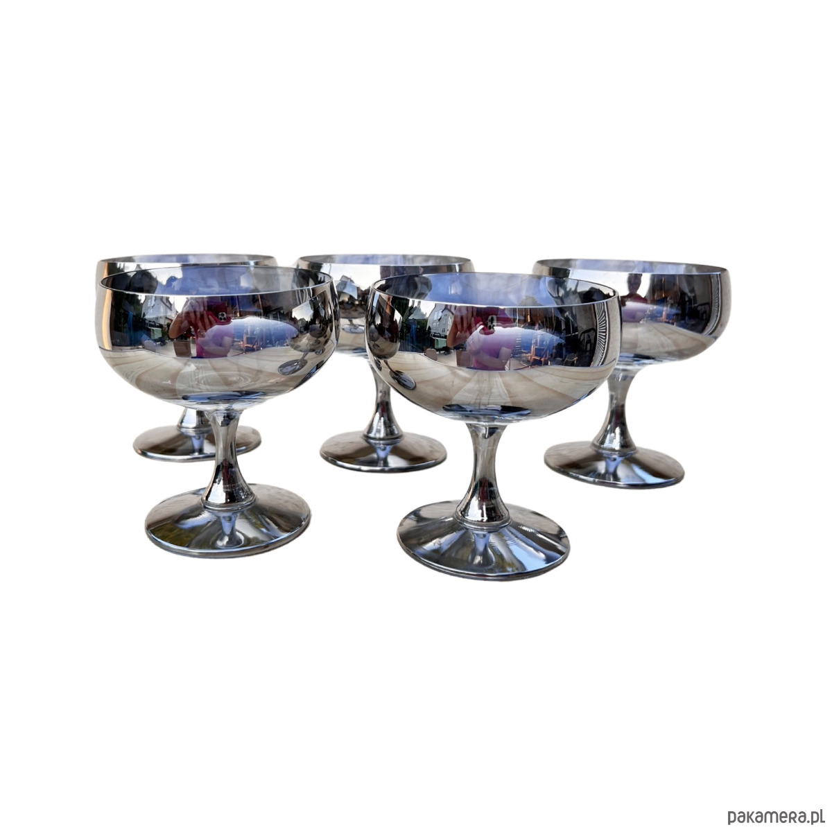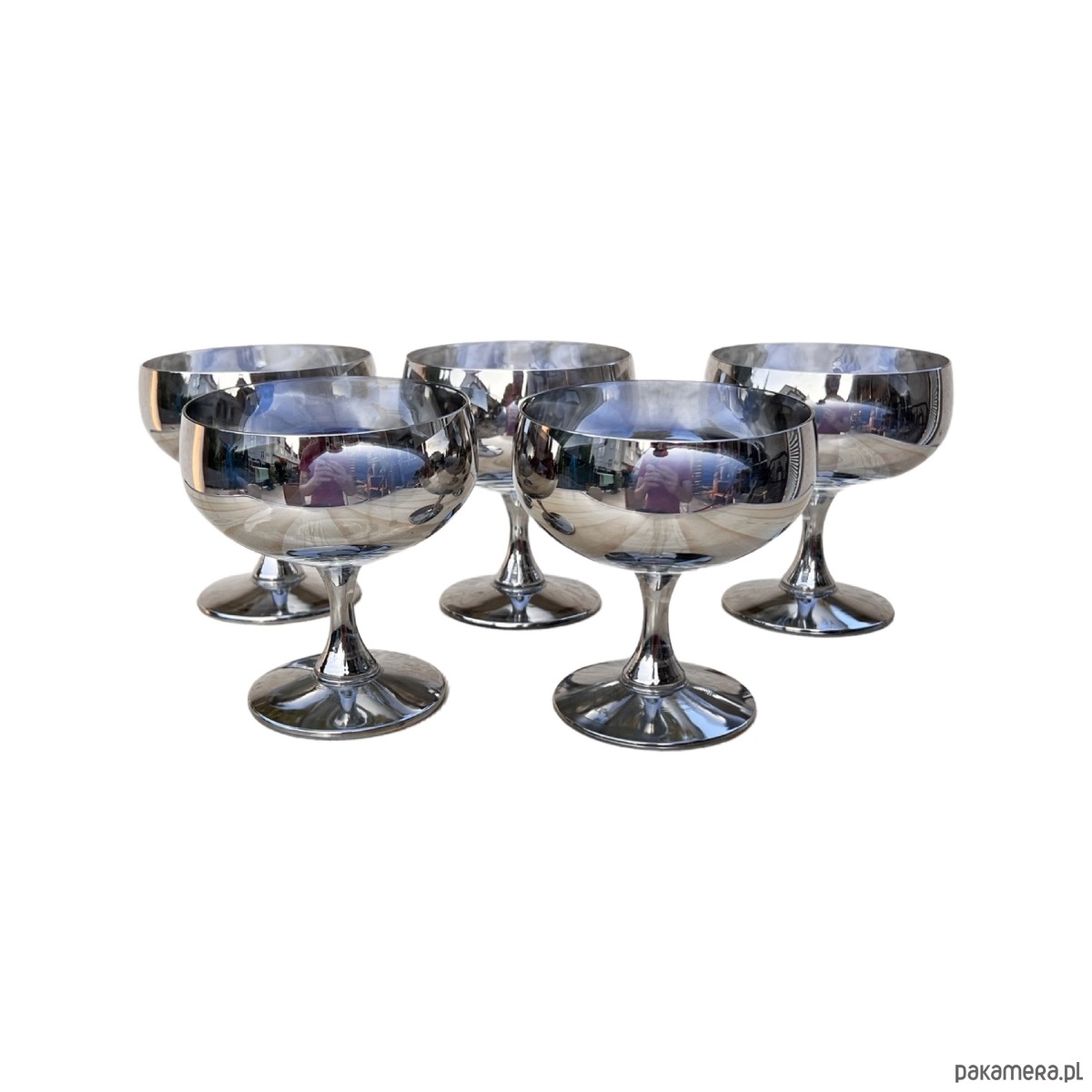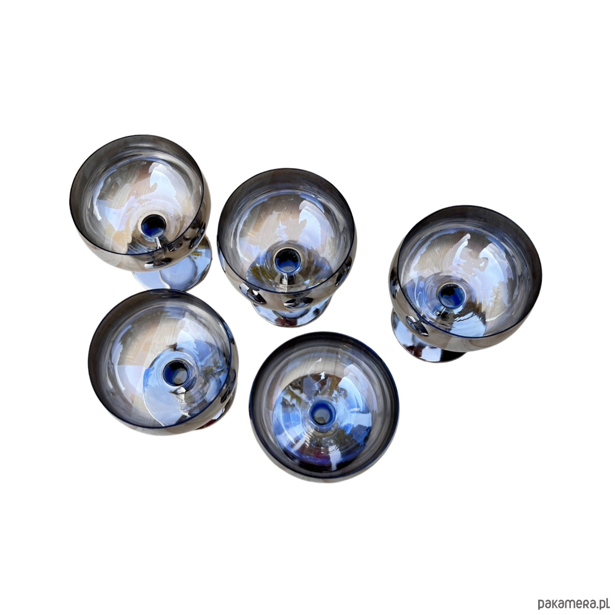 Komplet 5 szklanych ręcznie wykonanych kieliszków do szampana lub pucharków na lody wyprodukowanych we Polsce dla Huty Szkła Józefina w Krośnie w latach 80. Kieliszki do szampana o charakterystycznym, prostym kształcie - wykonane ze szkła srebrzonego, dymionego.Kieliszki w stanie oryginalnym bardzo dobrym z normalnymi śladami użytkowania. Wykonane z ręcznie zdobionego szkła.