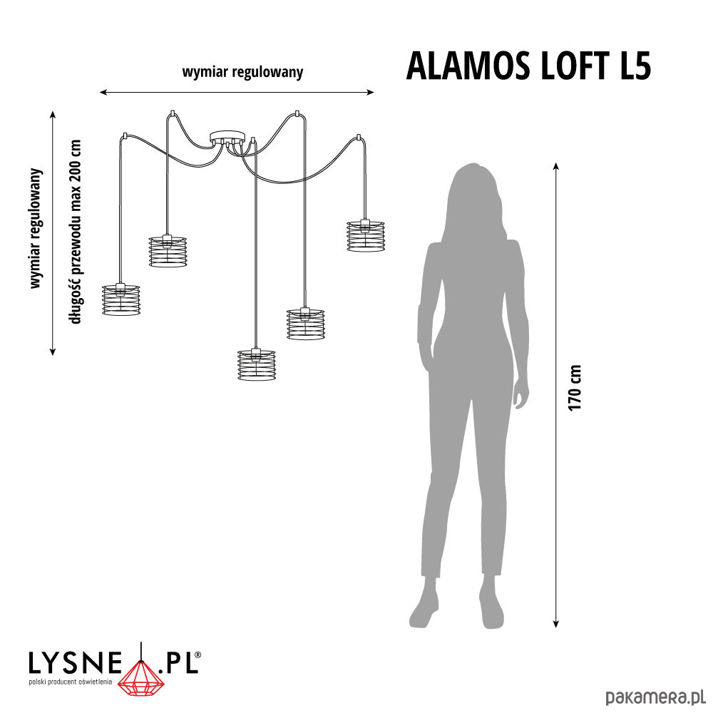 Wymiary lampy: wysokość - wymiar regulowany max 200 cm, szerokość - wymiar regulowany