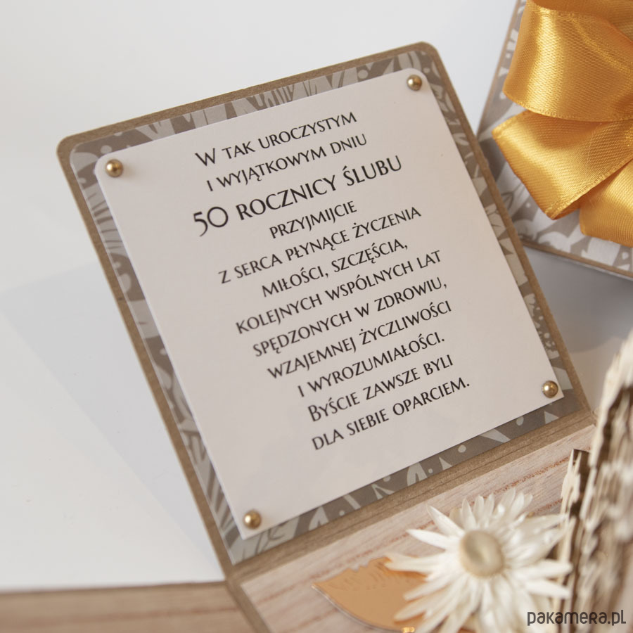 Ręcznie robiona kartka z okazji 50 rocznicy ślubu w formie rozkładanego pudełeczka.
