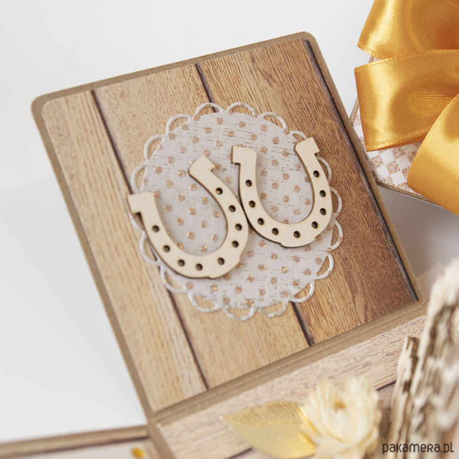 Na środku pudełeczka znajduje się dekoracja z papierowymi kwiatuszkami, na ściankach motyw serca, życzenia dla solenizantów, miejsce na podpis oraz motyw podkowy na szczęście.