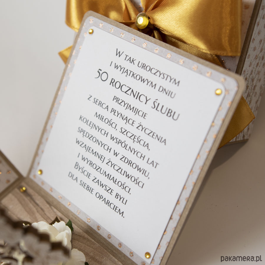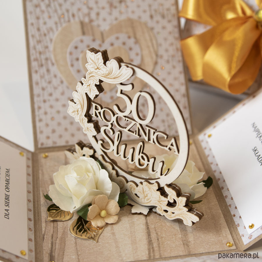 Ręcznie robiona kartka z okazji 50 rocznicy ślubu w formie rozkładanego pudełeczka.